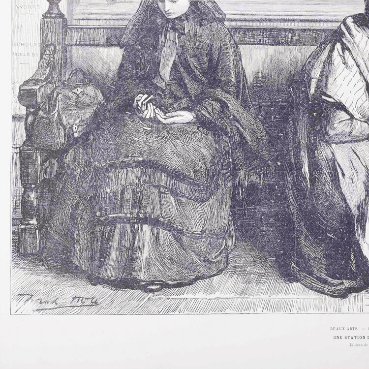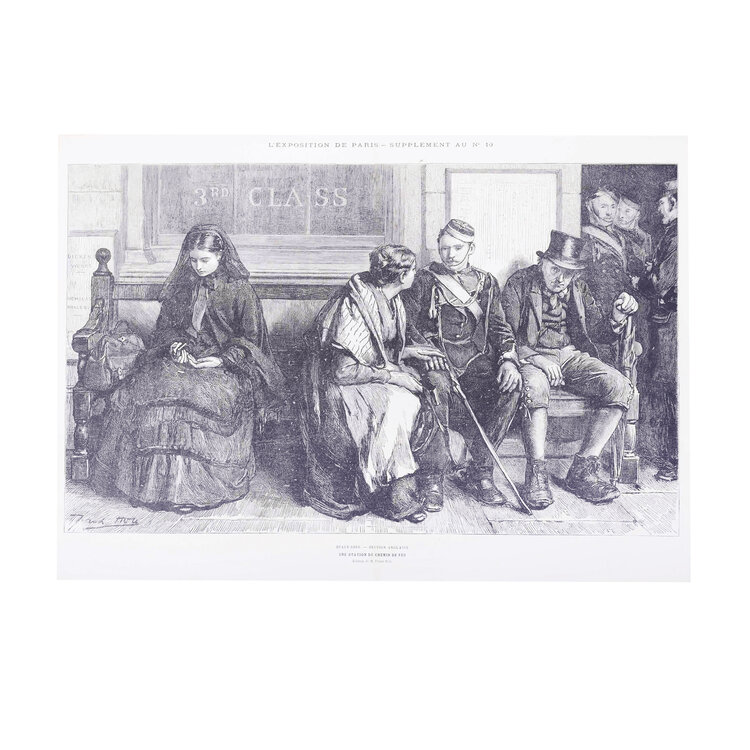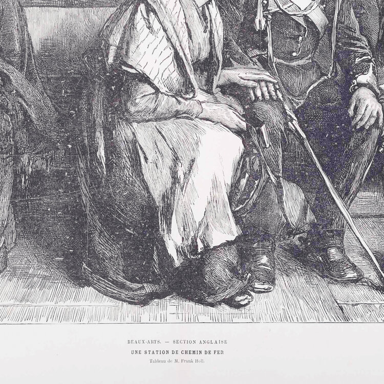 Prent 'Une station de chemin de fer'. Naar een werk van Frank Holl. De prent toont passagiers die wachten op een trein op het perron, 3e klas. Geschiedenis van de Victoriaanse spoorwegen van de 19e eeuw. De prent komt uit een magazine, de vouwlijn in het midden van de prent is zichtbaar. Datering: eind 19e eeuw. Conditie: De prent heeft sporen van ouderdom. Verkleuring, vlekken en kleine beschadigingen aan de randen. Afmetingen van papier prent: 37 x 52,5 cm.