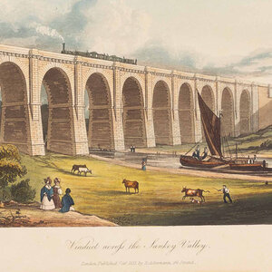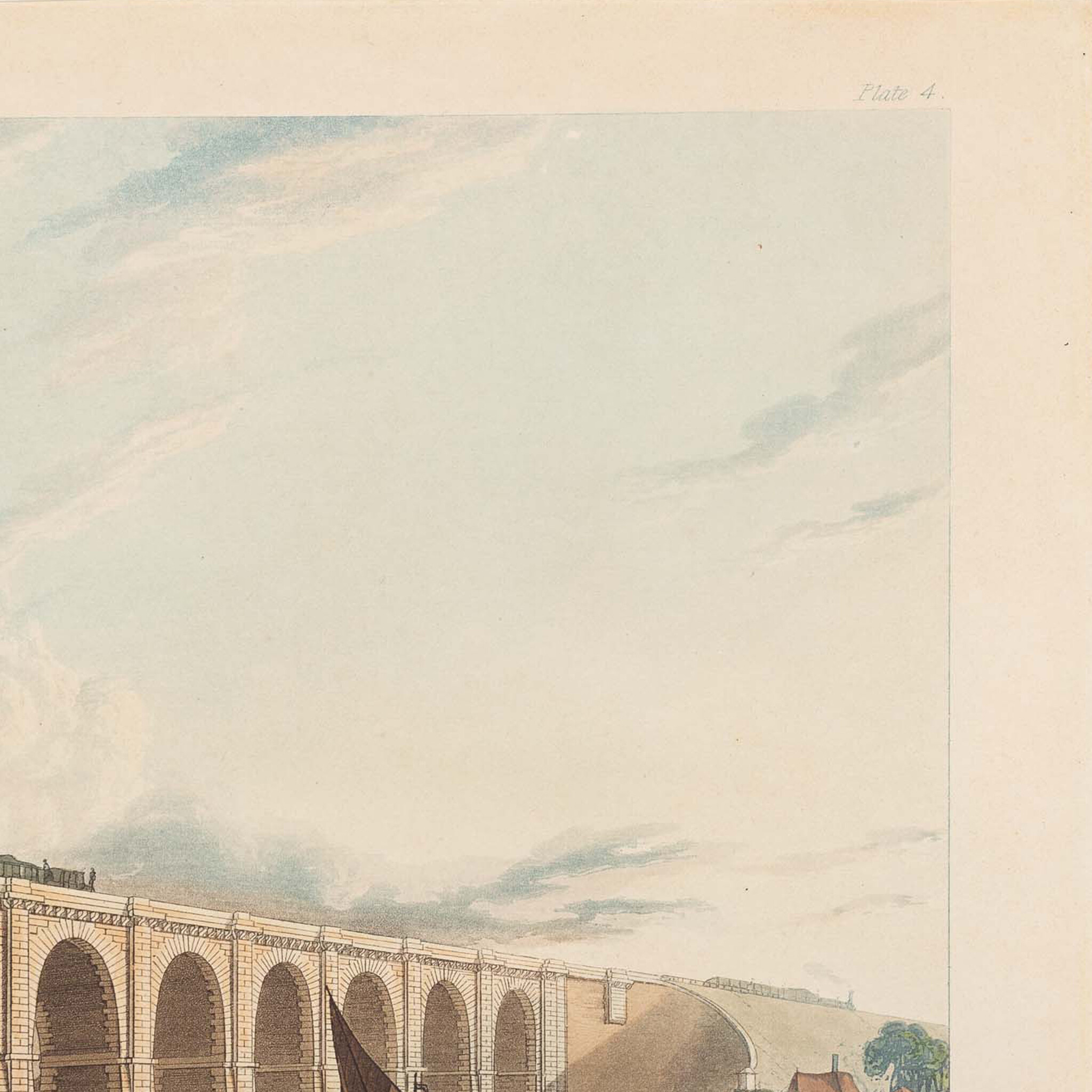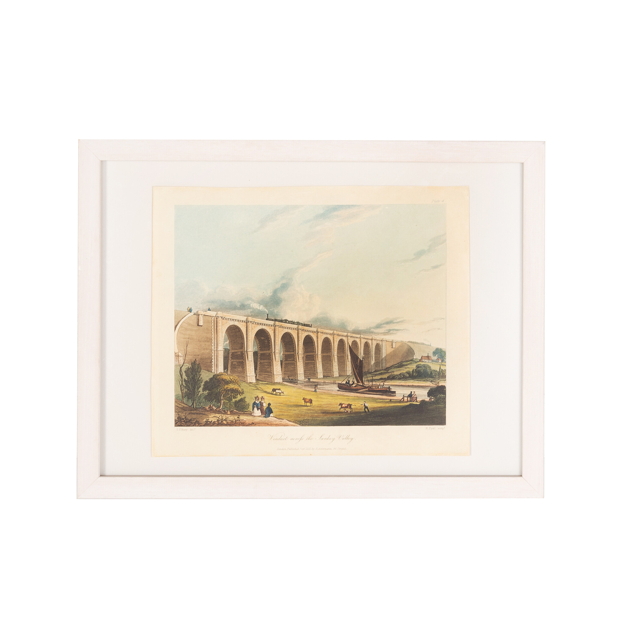 Prent 'Viaduct across the Sankey Valley'. London, Published Feb 1831 by R. Ackermann, 96 Strand. Ingekleurde aquatint van Henry Pyall (1795-1833) naar een aquarel van Thomas Talbory Bury (1809-1877), in blankhouten lijst. Plaat 4 uit een serie van zes aquatinten, getiteld 'Coloured Views of the Liverpool and Manchester Railway'. Afbeelding van het Sankey Viaduct waar The Liverpool and Manchester Railway het Sankey Canal kruist op een hoogte van 21,3 m. The Liverpool and Manchester Railway was een belangrijke spoorweg die inspeelde op de toenemende commerciële en industriële vraag naar sneller vervoer van goederen en materialen. De aquarel, het originele schilderij voor acquatint, van Thomas Talbory Bury bevindt zich in het National Railway Museum. Conditie: De prent heeft sporen van ouderdom, zoals verkleuring; gebruikssporen lijst. Afmetingen: lijst ca. 33 x 43 cm; papier ca. 25 x 29,5 cm.