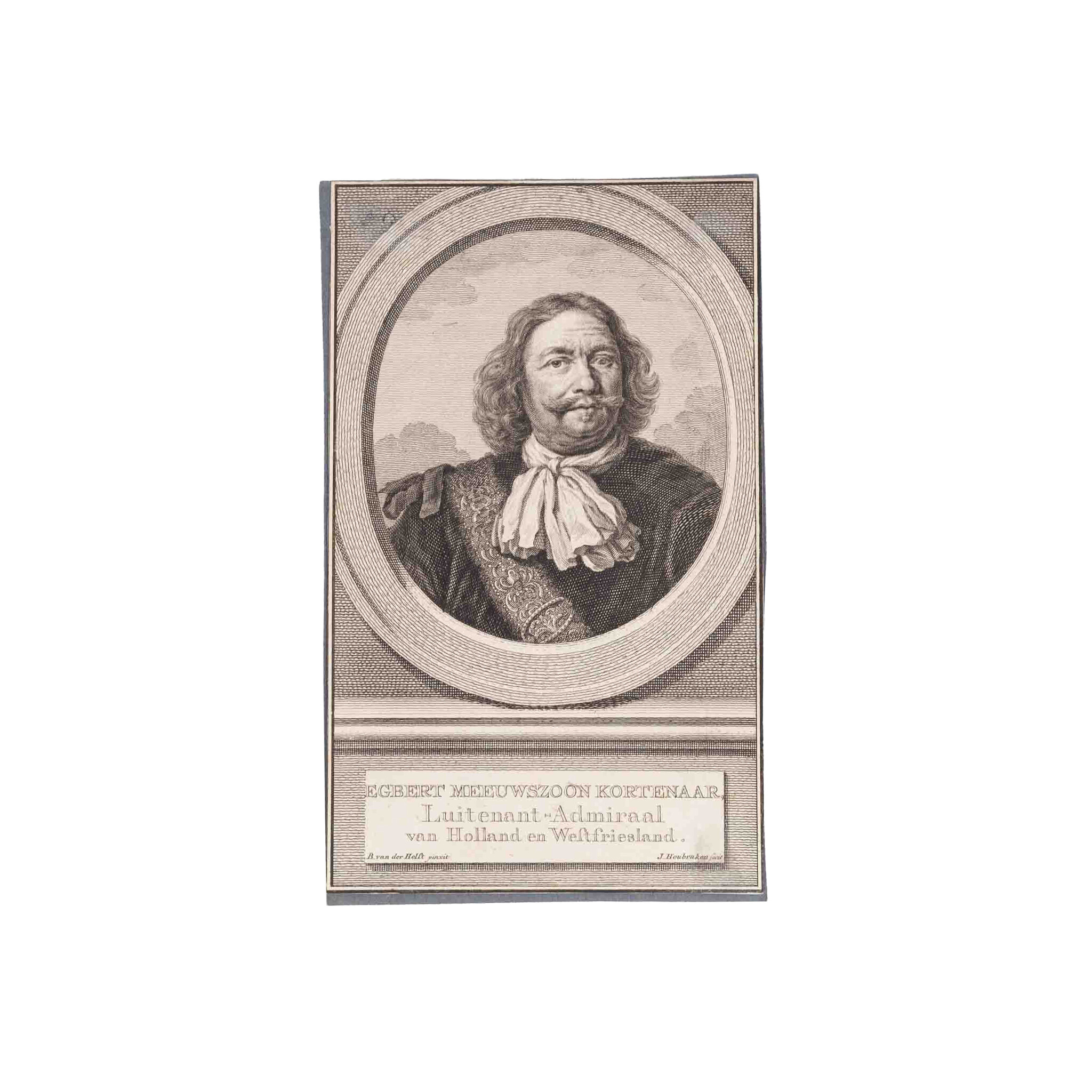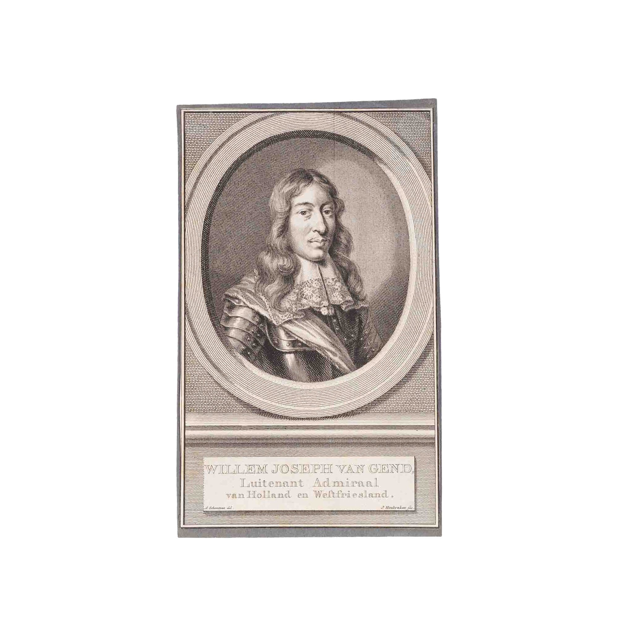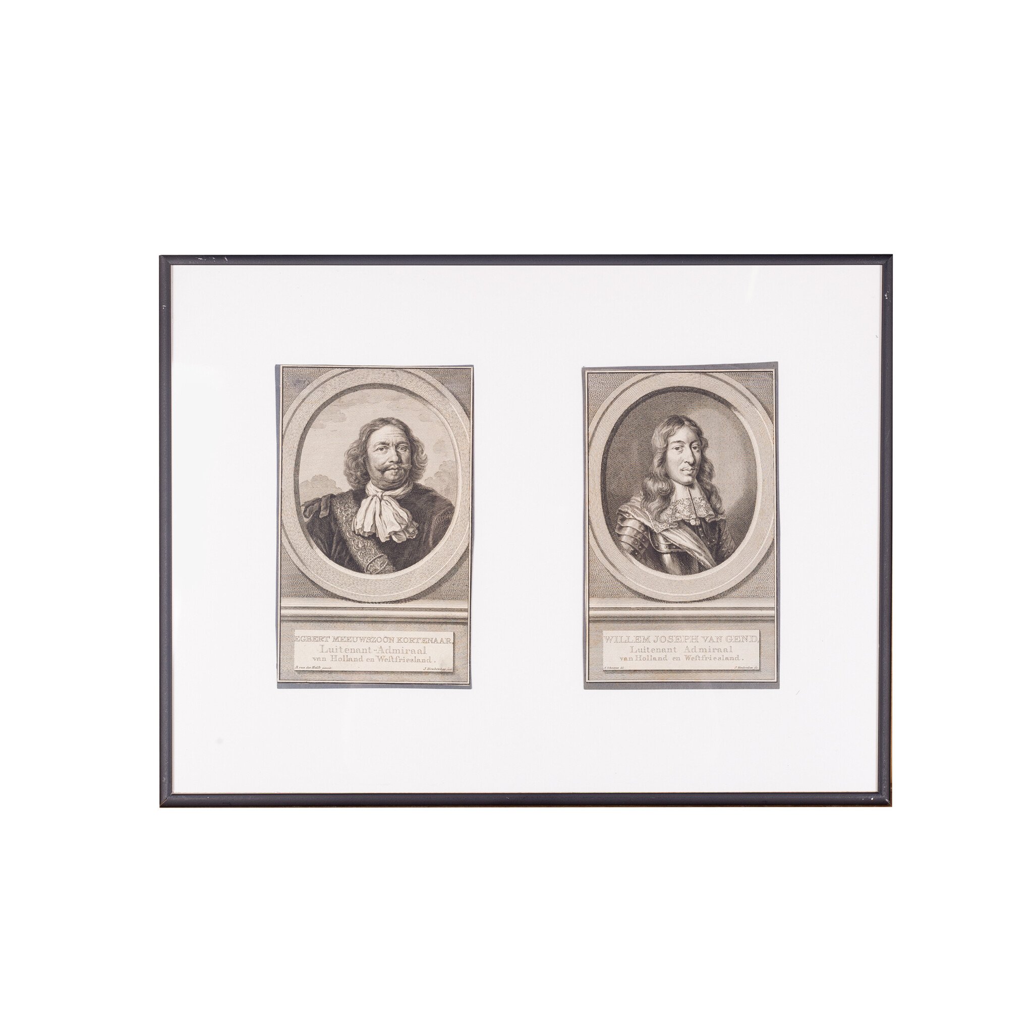 Prent 'Willem Joseph van Gend' (Winssen, 14 mei 1626 - Slag bij Solebay, 7 juni 1672), Luitenant Admiraal van Holland en Westfriesland; Prent 'Egbert Meeuwszoon Kortenaar' (Groningen, ca. 1604 - Lowestoft, Engeland, 13 juni 1665), Luitenant-Admiraal van Holland en Westfriesland. Gravures van Jacob Houbraken. De prenten zijn zwart-wit en zitten in een zwart metalen lijst. Datering: ca. 1749-1760. Conditie: De prenten vertonen sporen van ouderdom. Verkleuring, vlekken en kleine beschadigingen aan de randen. De prenten zijn geplakt op blauw papier. Gebruikssporen lijst. Afmetingen: lijst: ca. 30,5 x 40,5 cm; beeldvlak prenten: ca. 17 x 10 cm.