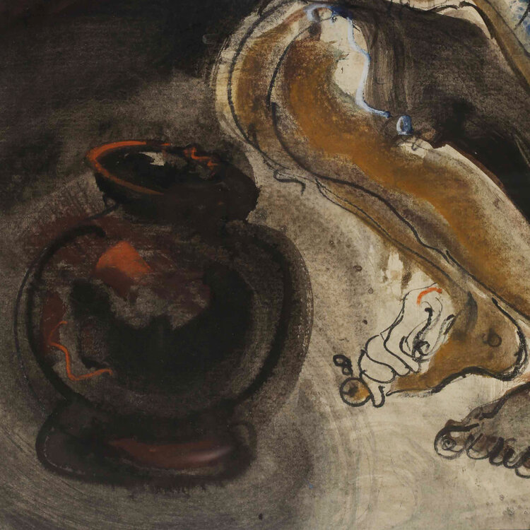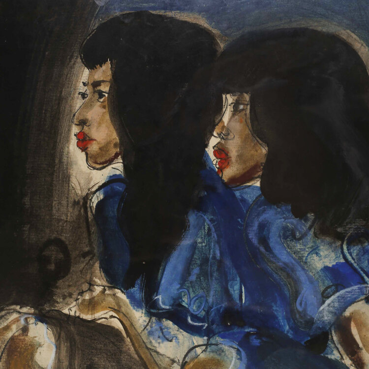 Pupuk, Waterdraagsters, jaartal onbekend. Aquarel op papier in metalen lijst. Afbeelding van twee zittende vrouwen in blauwe kleding, voor hun een kruik. Conditie: goed, gebruikssporen aan lijst. Afmeting werk zonder lijst: 40 x 48 cm.