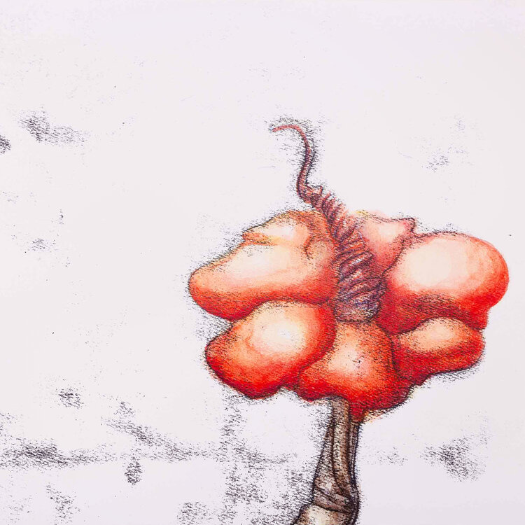 R. Martina, Lady on the rocks, 1981. Gemengde technieken op papier zonder lijst. Afbeelding van een vrouw met een blauwe doek en een rode bloem. Op de achterkant is een schets van de afbeelding te zien. Rechtsonder signatuur. Conditie: goed, het papier toont lichte gebruikssporen. Afmeting papier: 50 x 70 cm.