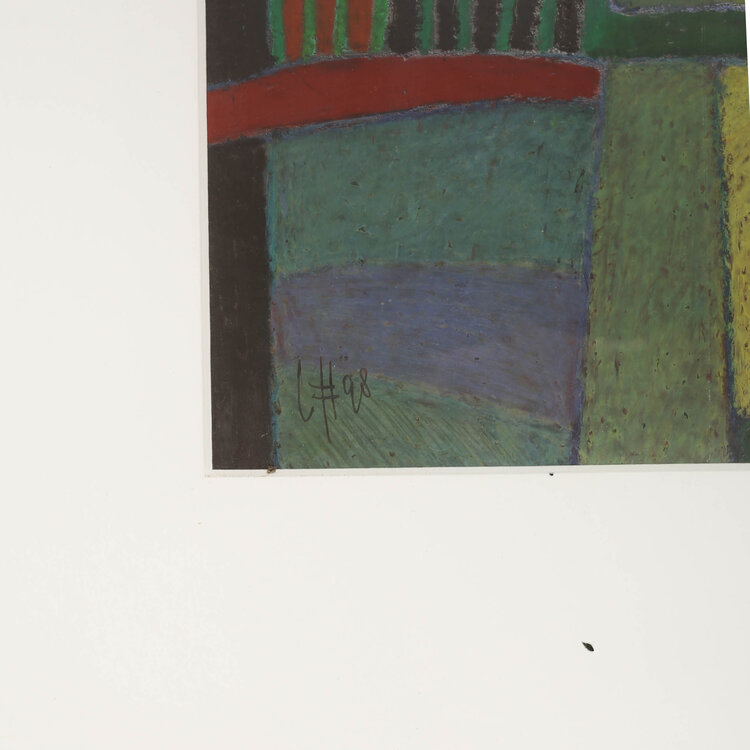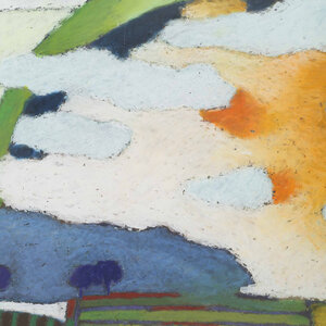 R.C.M. van Hoek, zonder titel, 1998. Olie-pastel op papier in metalen lijst. Kleurrijke afbeelding van een landschap met wolkenpartijen. Conditie: goed, gebruikssporen aan lijst. Afmeting werk zonder lijst: 41 x 51 cm; incl. lijst: 58,5 x 70 cm.