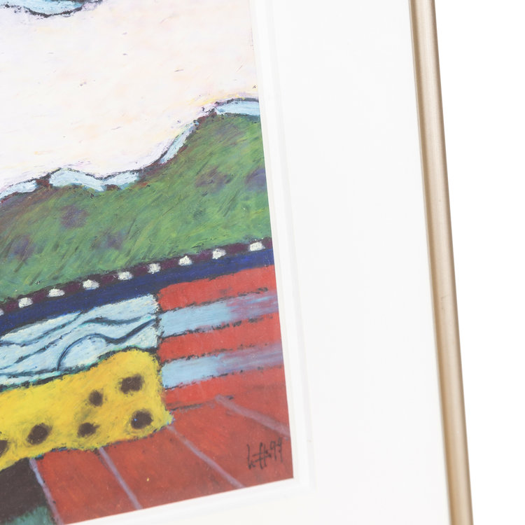 R.C.M. van Hoek, zonder titel, jaartal onbekend. Oliekrijt op papier in metalen lijst, 22/36. Kleurrijke afbeelding van een landschap met wolkenpartijen. Conditie: goed, gebruikssporen aan lijst. Afmeting werk zonder lijst: 32 x 21 cm