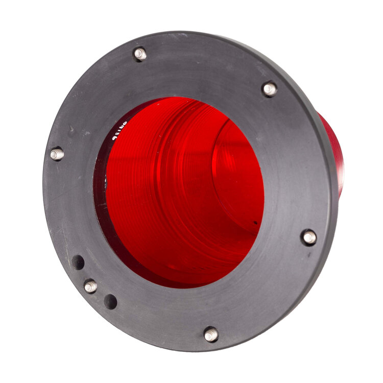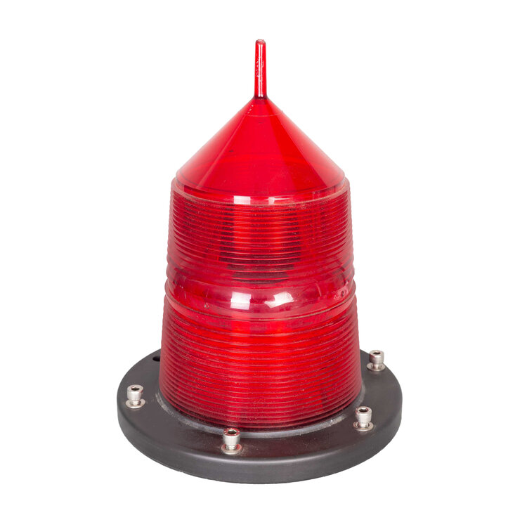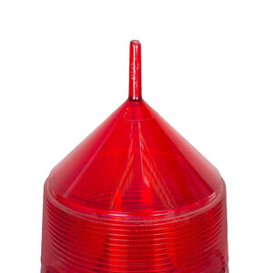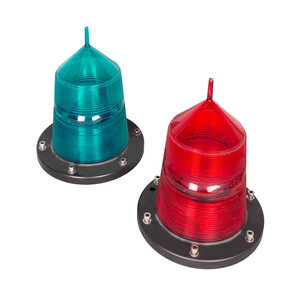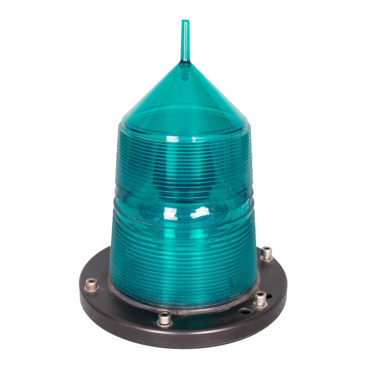 Omnibus lichtboei met groene en rode behuizing. Cilindervormig zwarte bus met witte tekst. Erboven rechthoekig gedeelte waarin draaiende fitting, waarin ruimte voor zes lampen. Er bijbehorende rode en groene cilindrisch tapse beschermkap op zwarte ring. Conditie: Hier en daar gebruikssporen, maar verder in goede staat. Lampen zijn niet aanwezig en snoer zit los, dus werking niet kunnen testen. Afmeting: 32,5 x ø 23,5 cm.