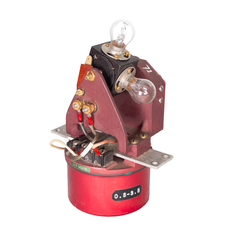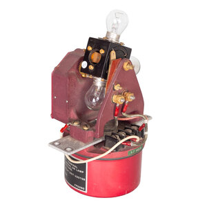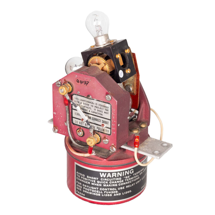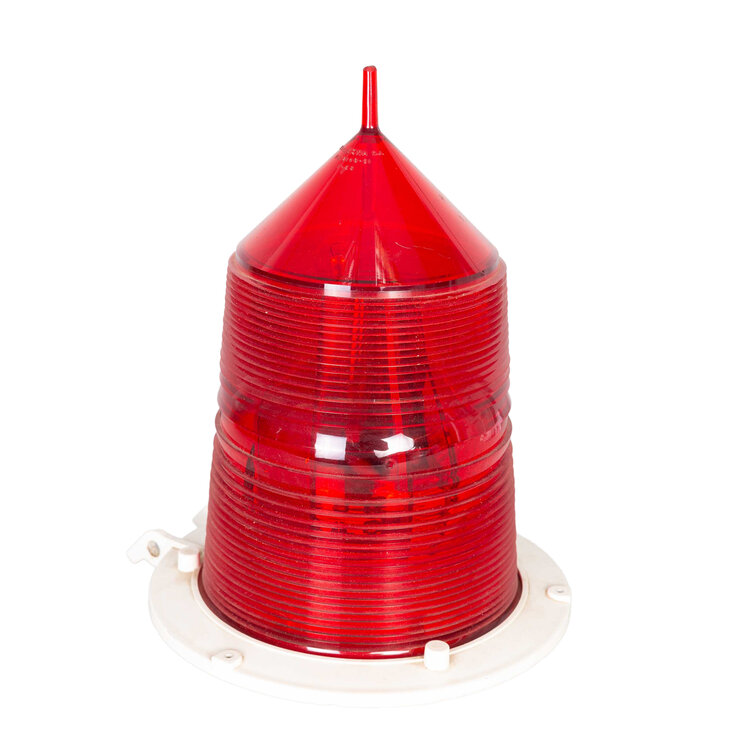 Boeilicht met rode beschermkap. Ronde paarse basis met daarboven draaibaar gedeelte met plek 4 lampen. Op basis zwarte plaat met in wit waarschuwingstekst. Taps cilindervortmide rode beschermkap met witte bevestigingsring. Datering: onbekend. Conditie: een lamp mist en hier en daar gebruikssporen, maar verder in goede staat. Werking niet getest. Afmetingen: 29 x ø 22,5 cm.