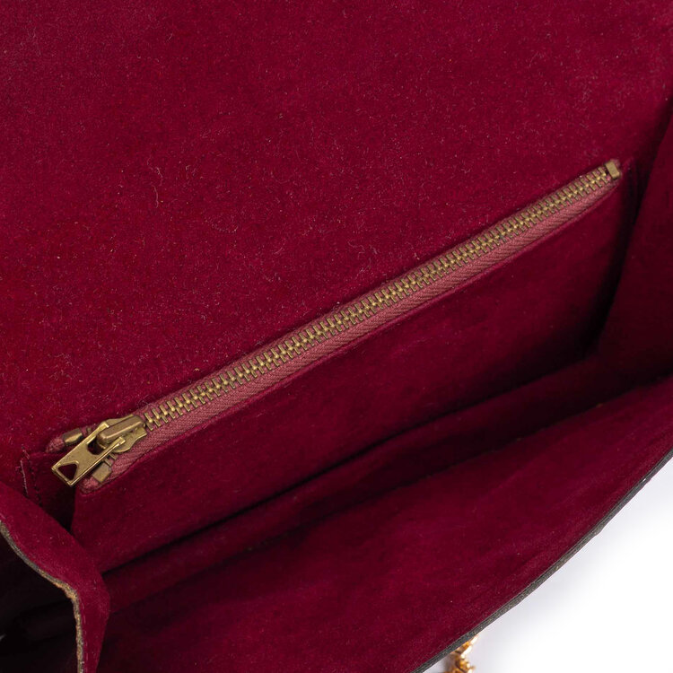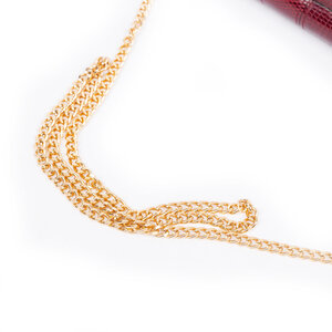 Elegant rood avondtasje met goud-kleurige details en ketting als schouderband. De tas is gemaakt van vierkante vlakken geschubd imitatie leer. Aan de binnenkant is het gevoerd met zachte stof en zit er een opbergvakje met rits. Datering: onbekend. Conditie: nog in mooie conditie, met enkel hier en daar lichte gebruikssporen. Afmeting: 13 x 22 x 2 cm.