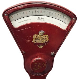 Rode winkelweegschaal, stond oorspronkelijk op een toonbank. De weegschaal werkt niet meer; de wijzer reageert niet op het gewicht. Datering: vermoedelijk eerste helft 20ste eeuw.