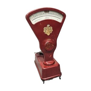 Rode winkelweegschaal, stond oorspronkelijk op een toonbank. De weegschaal werkt niet meer; de wijzer reageert niet op het gewicht. Datering: vermoedelijk eerste helft 20ste eeuw. Conditie: enkele beschadigingen aan de laklaag. Afmetingen: 35.0 x 18.0 x 59.0 cm.