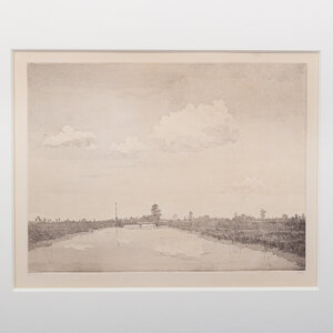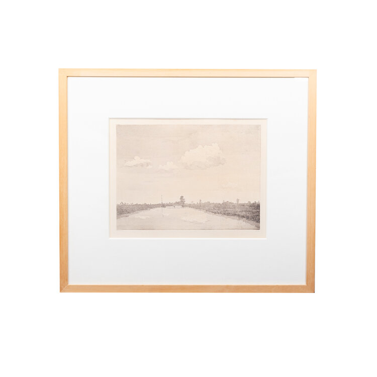 Reinder Homan (Smilde (Midden-Drenthe), 1950), 'Het Bruggetje', 1978. Ets oplage van 40, in houten lijst met passe-partout. Zwart-wit afbeelding van een waterloop met bruggetje. Signatuur linksonder. Datering: 1978. Conditie: verkleuring ets, lichte gebruikssporen lijst. Afmetingen lijst: 41,5 x 47,5 cm; beeldvlak: 19 x 26 cm.