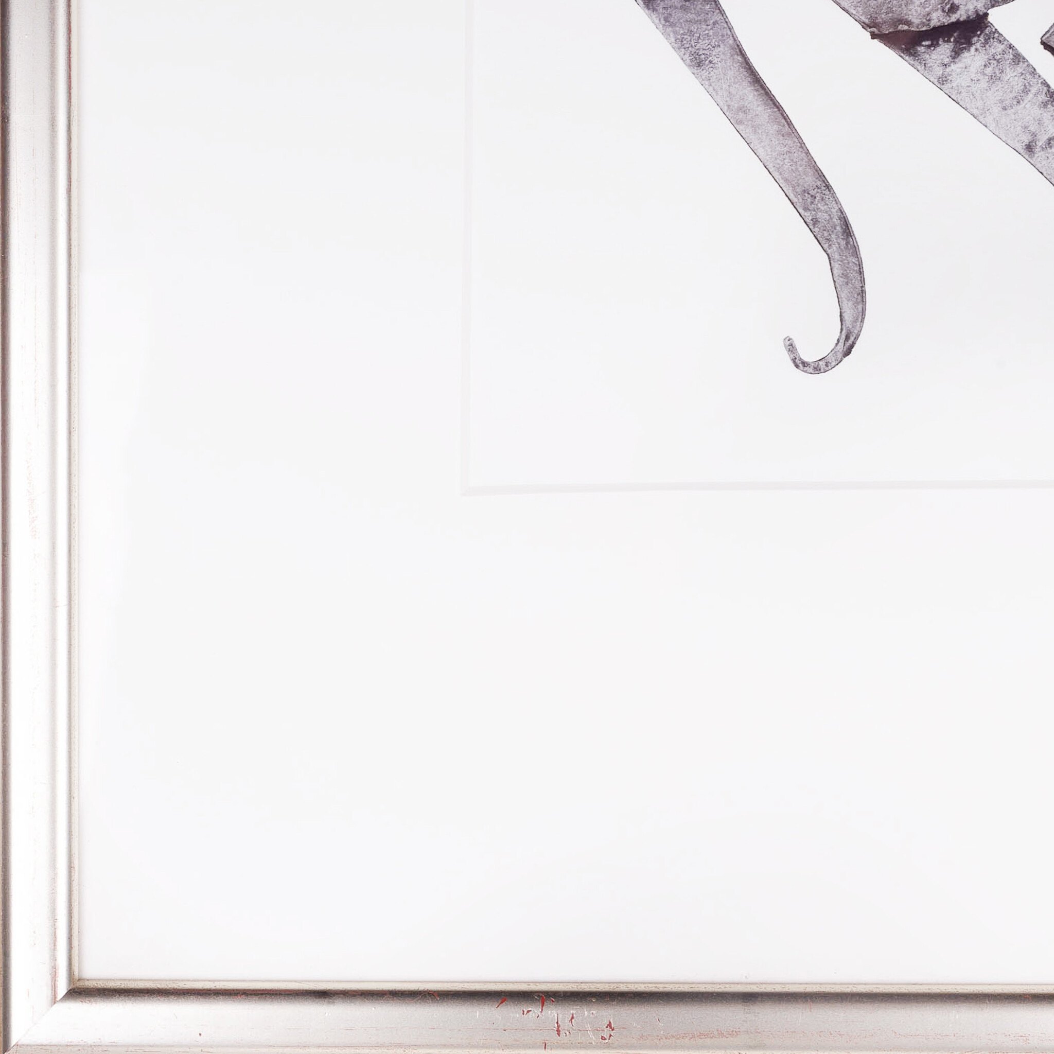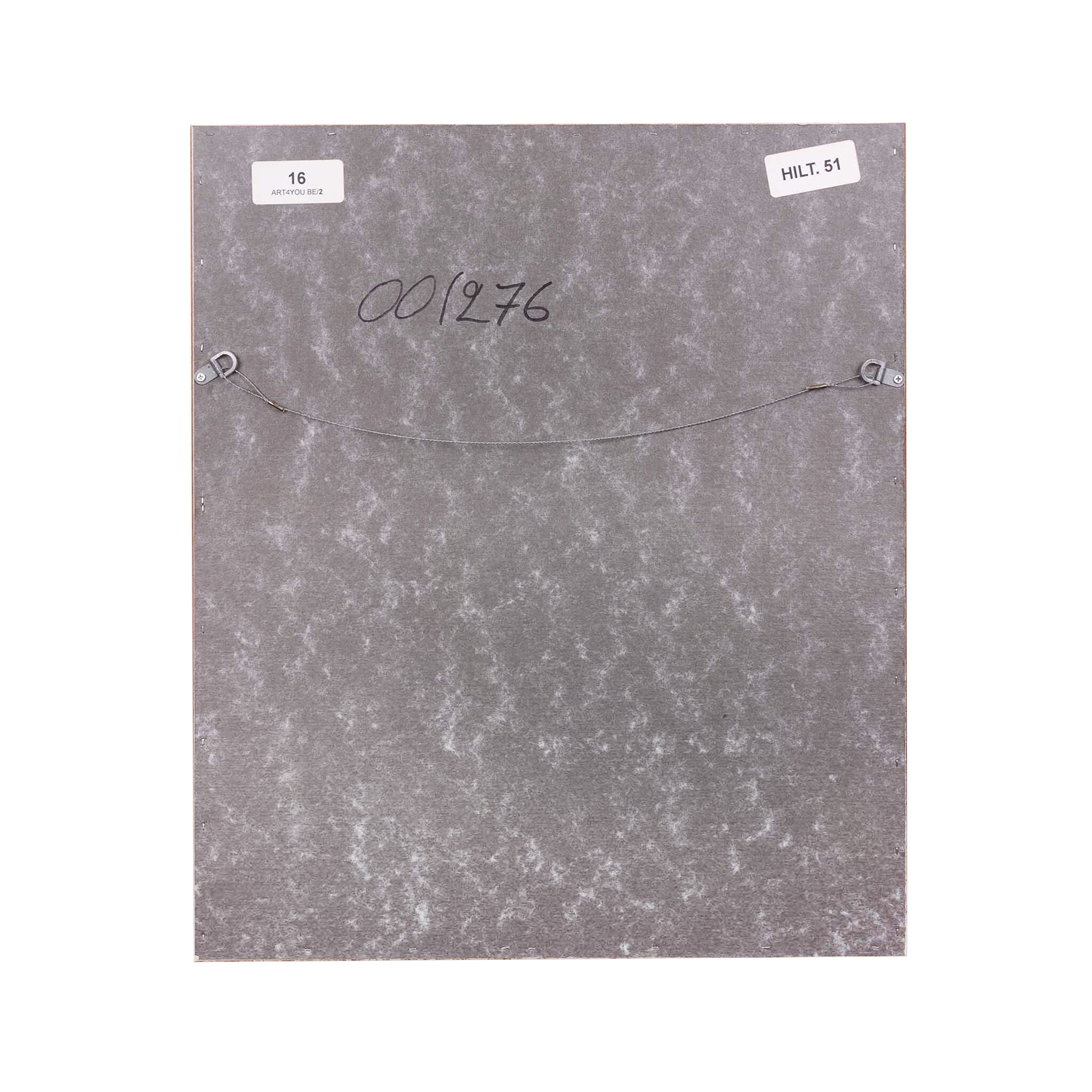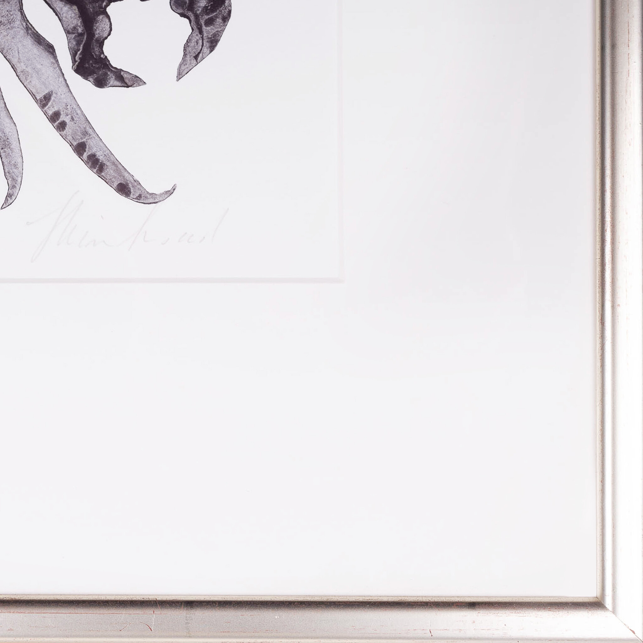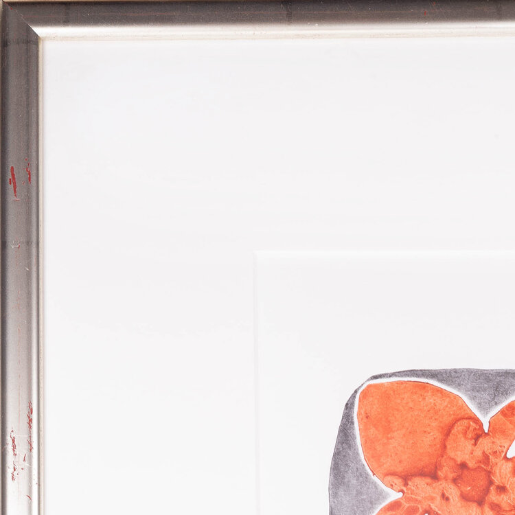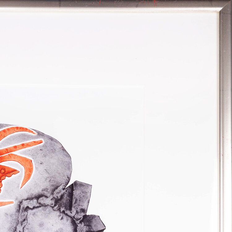 Reinhoud D'Haese, 'Araignées', jaartal onbekend. Kleurenets op papier in zilverkleurige lijst. Afbeelding van een zwarte spin met op zijn rug een kleine rode spin. Voor deze ets heeft de kunstenaar metalen platen aan elkaar gesmeed en vervolgens op verschillende plekken gehamerd. De vormen die daarmee ontstaan zijn heeft hij vervolgens gemaakt om deze afdruk van te maken. Het werk is rechtsonder gesigneerd. Conditie: goed. Afmetingen lijst: 49 x 42 cm.
