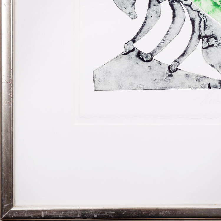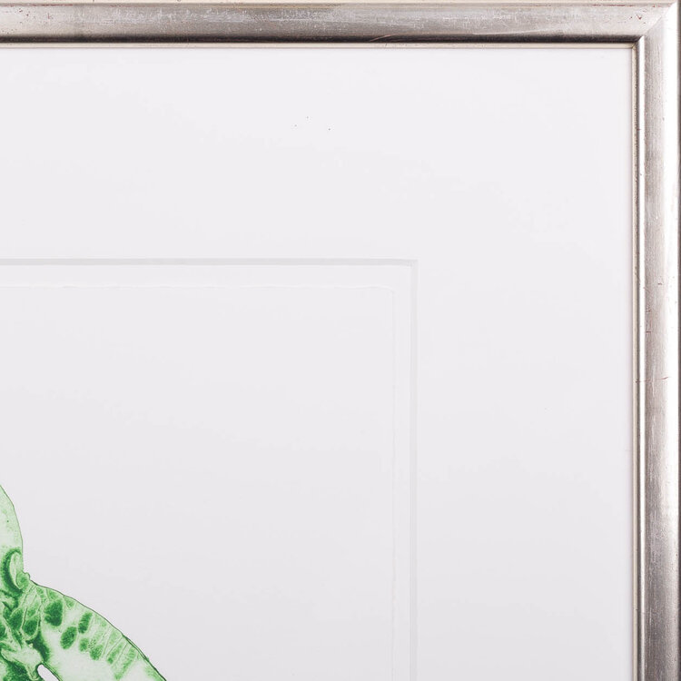 Reinhoud D'Haese, 'Insecte', jaartal onbekend. Kleurenets op papier in zilverkleurige lijst. Afbeelding van een insect die aan het vervellen is. Het insect is groen en zijn oude vel waar hij uit klimt is zwart. Voor deze ets heeft de kunstenaar metalen platen aan elkaar gesmeed en vervolgens op verschillende plekken gehamerd. De vormen die daarmee ontstaan zijn heeft hij vervolgens gemaakt om deze afdruk van te maken. Het werk is rechtsonder gesigneerd. Conditie: goed. Afmetingen lijst: 49 x 42 cm.