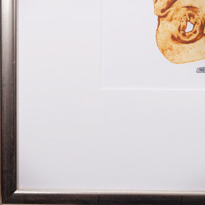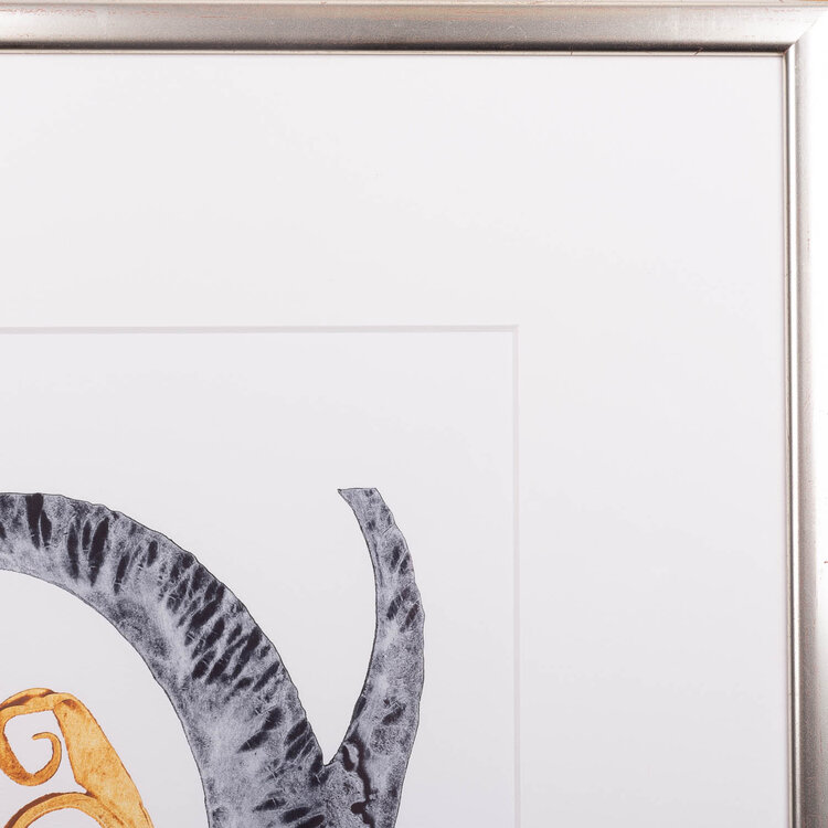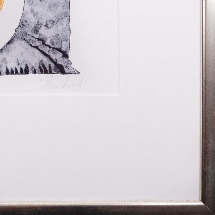 Reinhoud D'Haese, 'Pieuvre', jaartal onbekend. Kleurenets op papier in zilverkleurige lijst. Afbeelding van een fantasiedier die wat weg heeft van een octopus en ondersteboven hangt aan een tak. Voor deze ets heeft de kunstenaar metalen platen aan elkaar gesmeed en vervolgens op verschillende plekken gehamerd. De vormen die daarmee ontstaan zijn heeft hij vervolgens gemaakt om deze afdruk van te maken. Het werk is rechtsonder gesigneerd. Conditie: goed. Afmetingen lijst: 49 x 42 cm