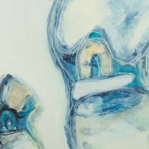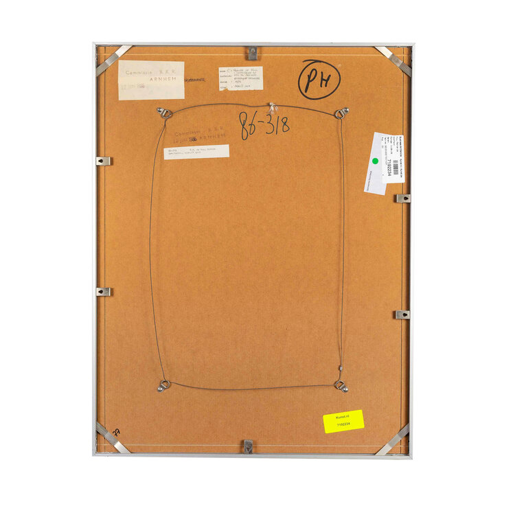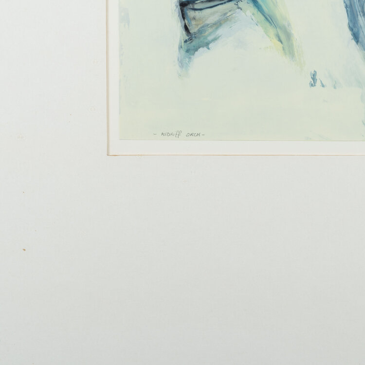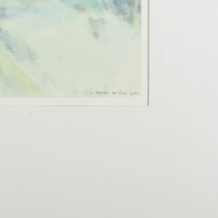 Reinier de Huu, Midriff arch, 1986. Gemengde techniek op papier in metalen lijst. Abstracte compositie in blauw, geel en groen. Conditie: goed, lijst toont lichte gebruikssporen. Afmetingen: werk: 39 x 29 cm, lijst 66 x 51 cm.