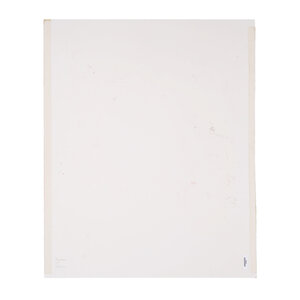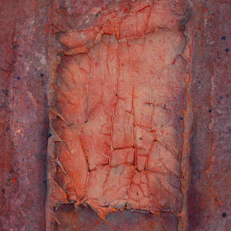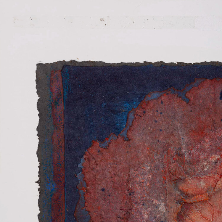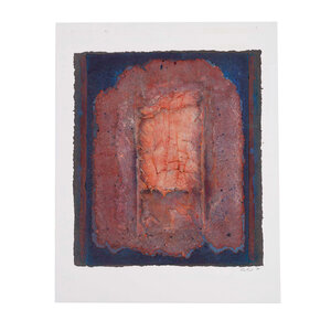 Ria Krol, Zonder titel, 1992. Papier schilderij op karton zonder lijst. Abstract werk van verschillende lagen papier-maché op elkaar in oranje en blauw. Signatuur rechtsonder. Conditie: het karton toont gebruikssporen, taperesten op het karton aan de voor- en achterkant. Afmeting karton: 89 x 70 cm.