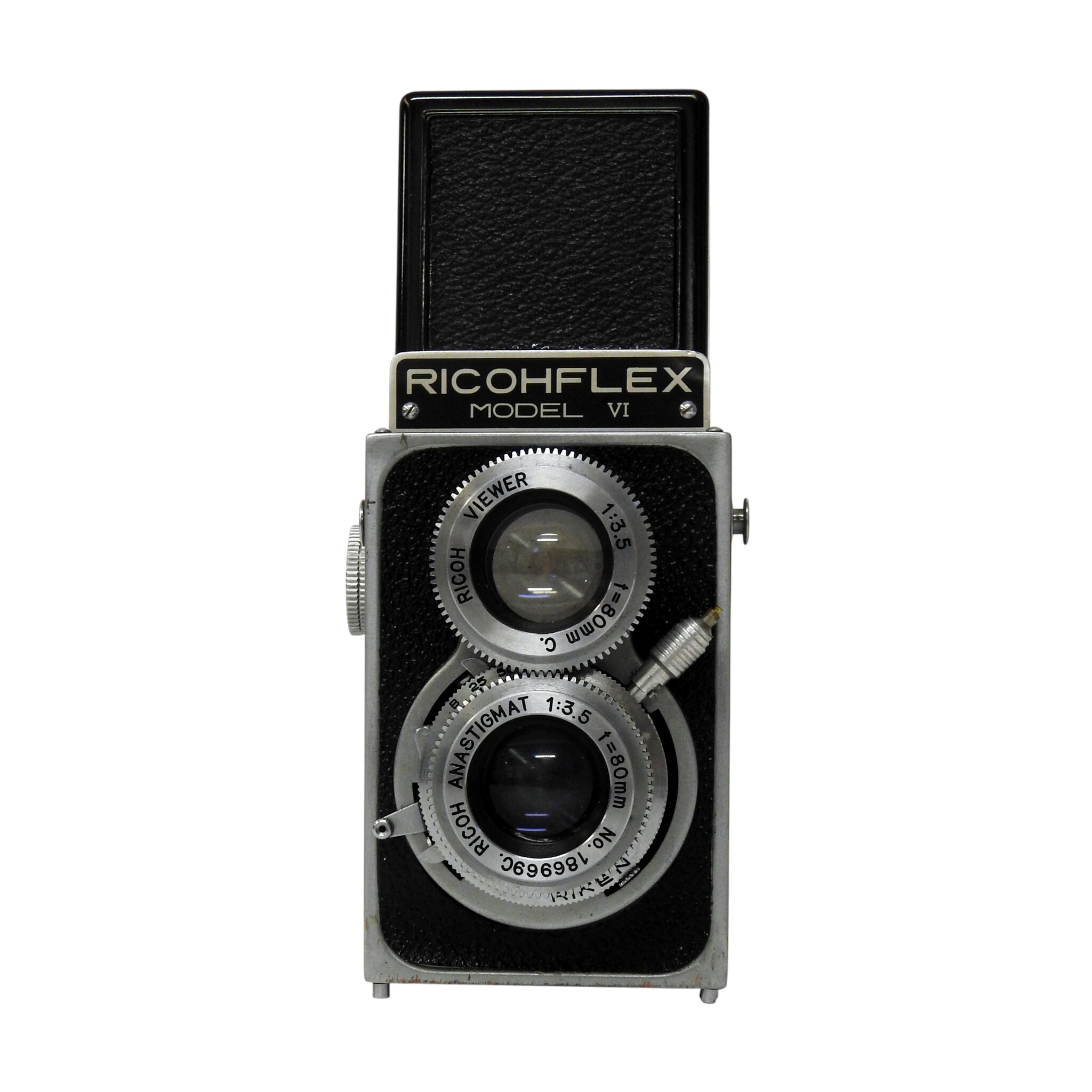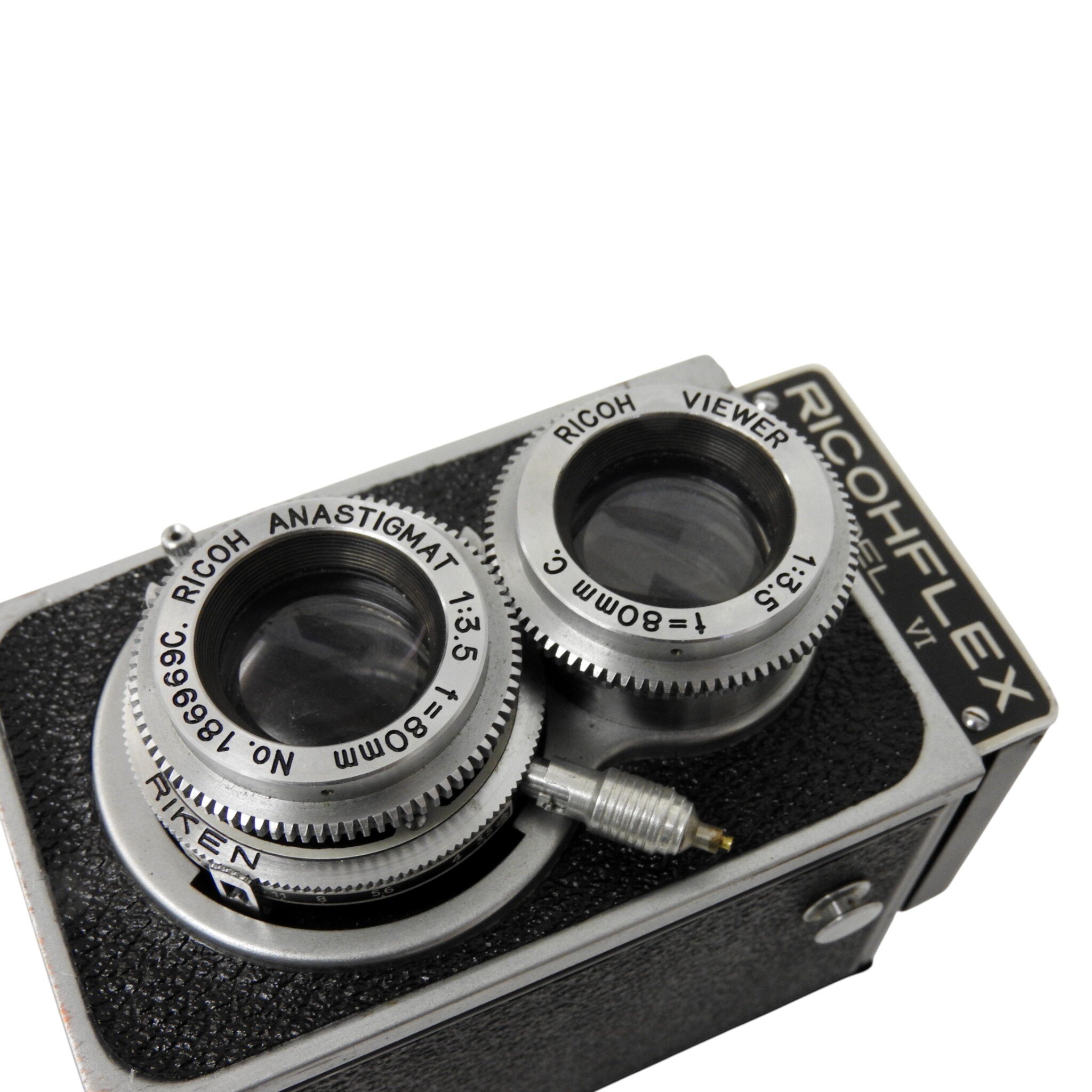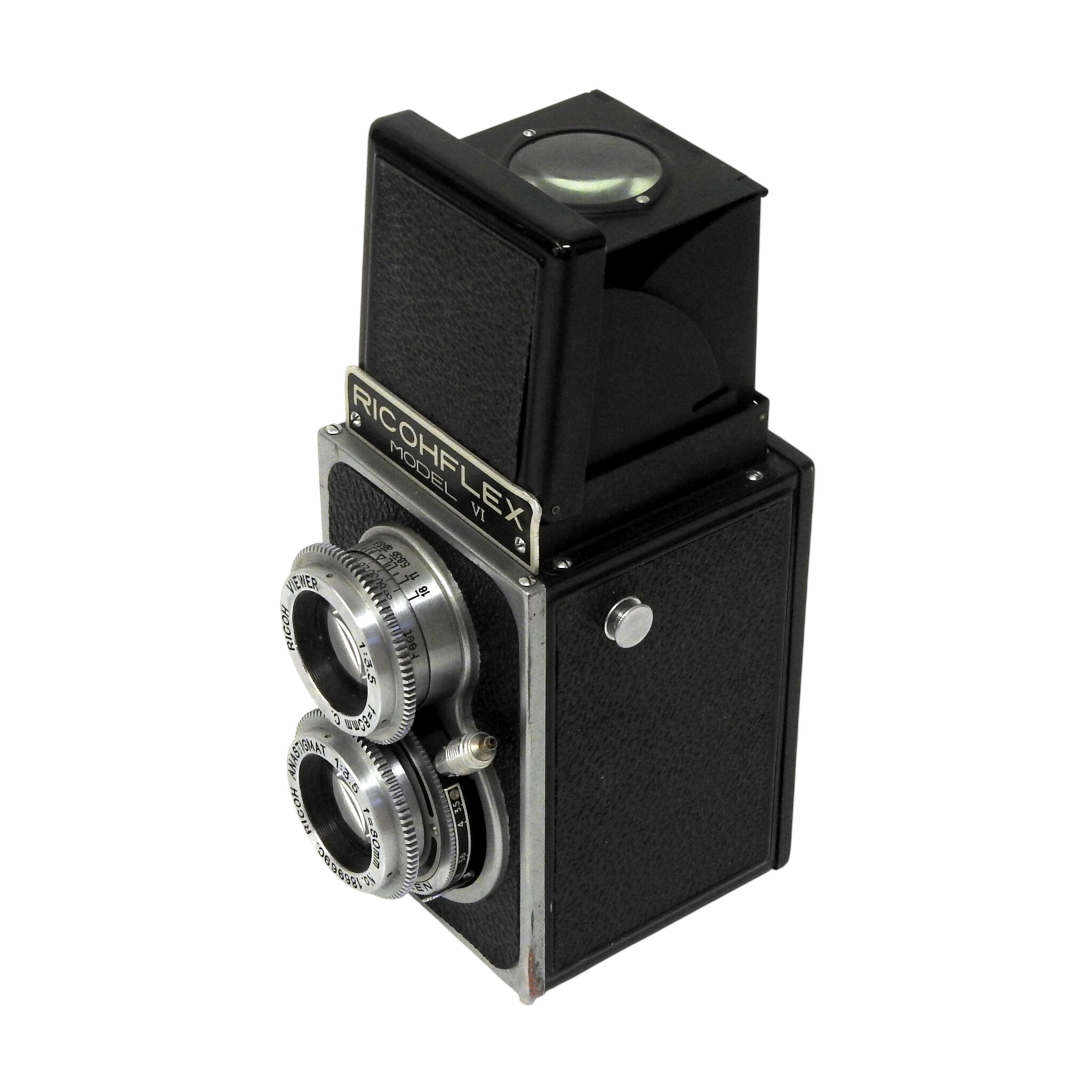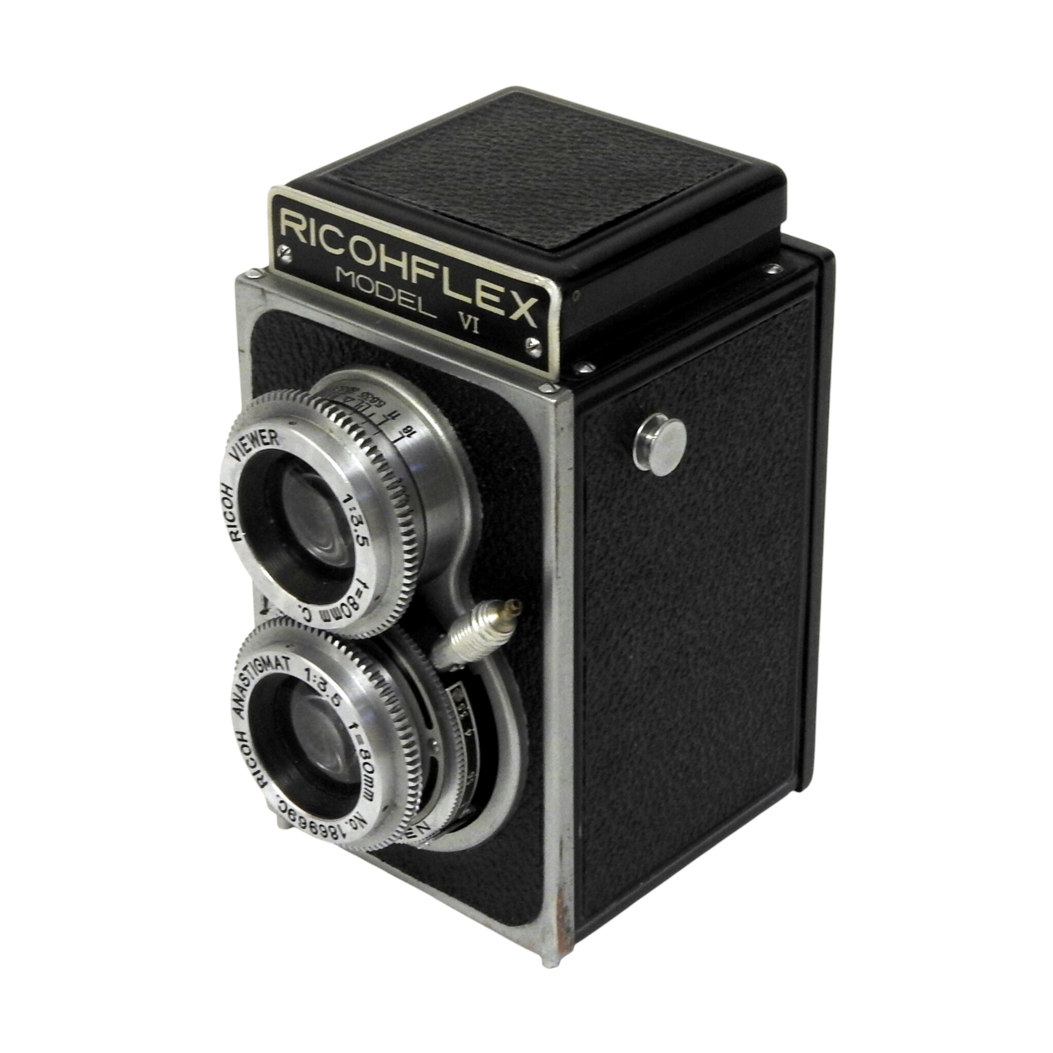 Ricohflex 6 x 6 spiegelreflexcamera model VI, bouwjaar 1953. Conditie: Geringe gebruiksporen aan de camerabody. Sluiter werkt niet meer. Alleen geschikt als vitrineobject. Afmetingen: H. 13 cm, Br. 8 cm, D. 10 cm.