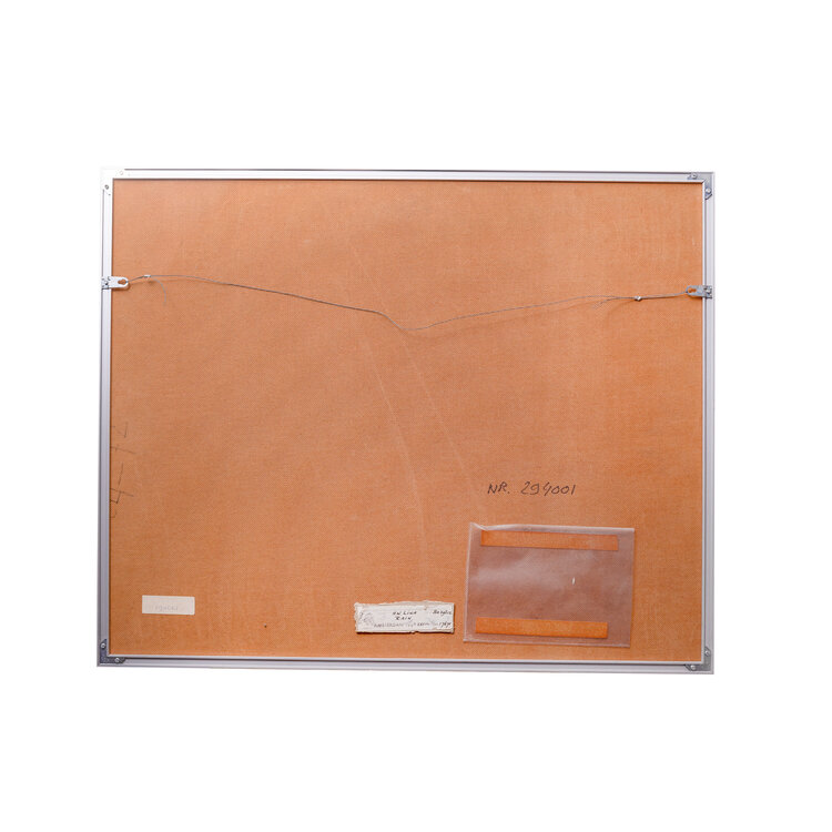 Rik Lina (Valkenburg aan de Geul, 1942), 'Rain'. Houtsnede oplage 5/5, met een afbeelding van een zee met kleurrijke verticale lijnen, in metalen lijst met passe-partout. Veel van zijn werken spelen zich af in een surrealistische onderwater wereld. Signatuur middenonder. Datering: 1966. Conditie: lijst vertoont gebruikssporen, werk heeft vlekken in de bovenhoeken. Afmetingen lijst: 65,5 x 80,5 cm; beeldvlak: 49 x 61 cm.