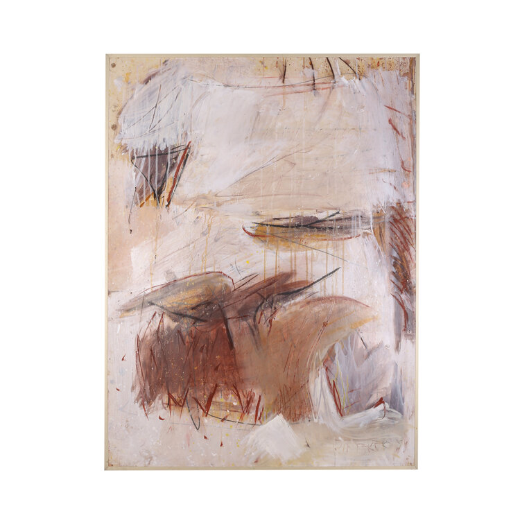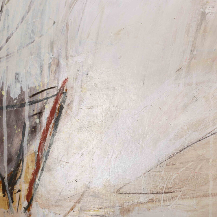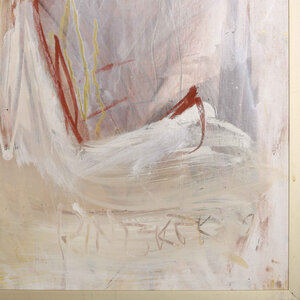 Rineke Kop, Zonder titel, jaartal onbekend. Acryl op karton in metalen lijst zonder glas. Abstracte compositie in wit, rood, zwart en geel. Signatuur rechtsonder. Conditie: gebruikssporen aan lijst en werk zit links een beetje los. Afmeting lijst: 108 x 79 cm.