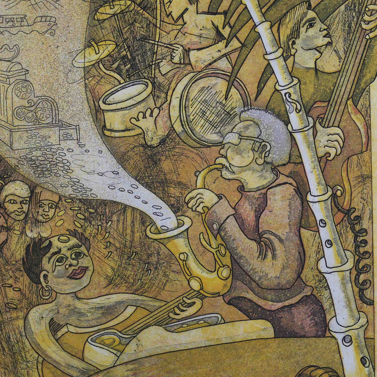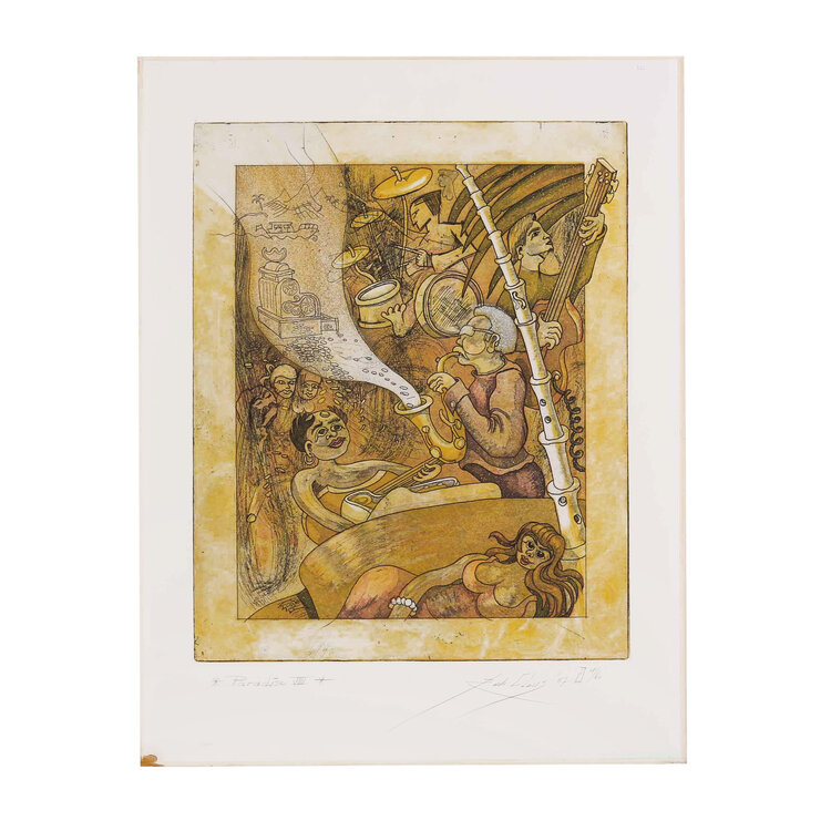 Rob Clous, Paradise 4, 1987. Kleurenets geplakt op karton, oplage 15/60. Vrolijke voorstelling in geel van mensen met muziekinstrumenten. Linksonder titel, rechtsonder signatuur, jaartal en oplagenummer. Op de achterzijde een tekst met informatie over de kunstenaar. Conditie: Het beeld zelf is in goede staat, aan de randen kleine beschadigingen en gebruikssporen. Afmeting werk zonder passe-partout: 65 x 50 cm.