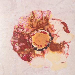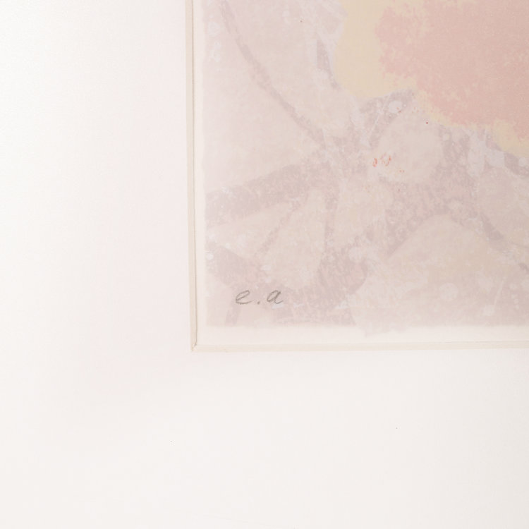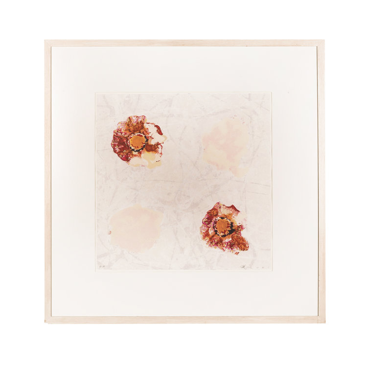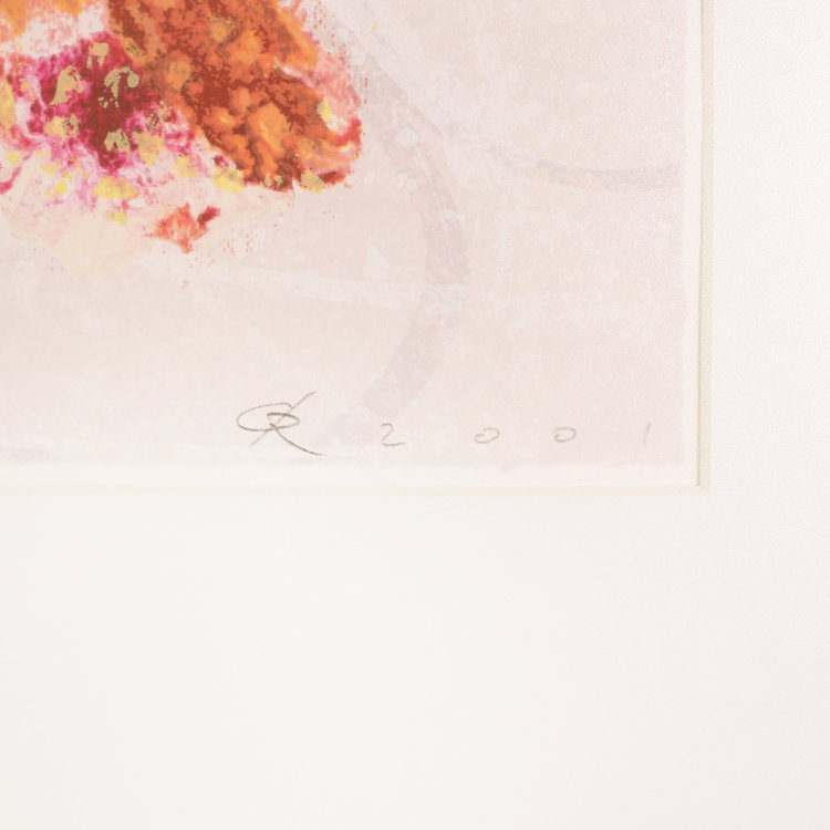 Rob de Graaf, Chaos is een aparte werkelijkheid, 2001. Zeefdruk op papier in wit houten lijst, E.A. Abstracte illustratie lijkend op bloemen voor een witte achtergrond. Linksonder in potlood e.a., rechtsonder signatuur en jaar. Conditie: goed, gebruikssporen aan lijst. Afmeting werk zonder lijst: 46 x 46 cm.