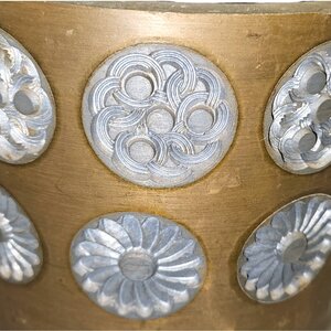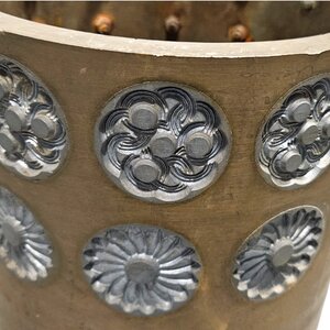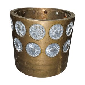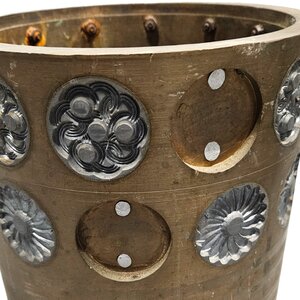 Rol voor biscuitmachine met uitsteekvorm, eerste helft 20ste eeuw. Hiermee werden vormen in het deeg gedrukt. Op deze rol zitten vormen voor ronde biscuits. Conditie: enkele vormen ontbreken, sporen van gebruik. Afmetingen: d. 20.0 x h. 18.0 cm.