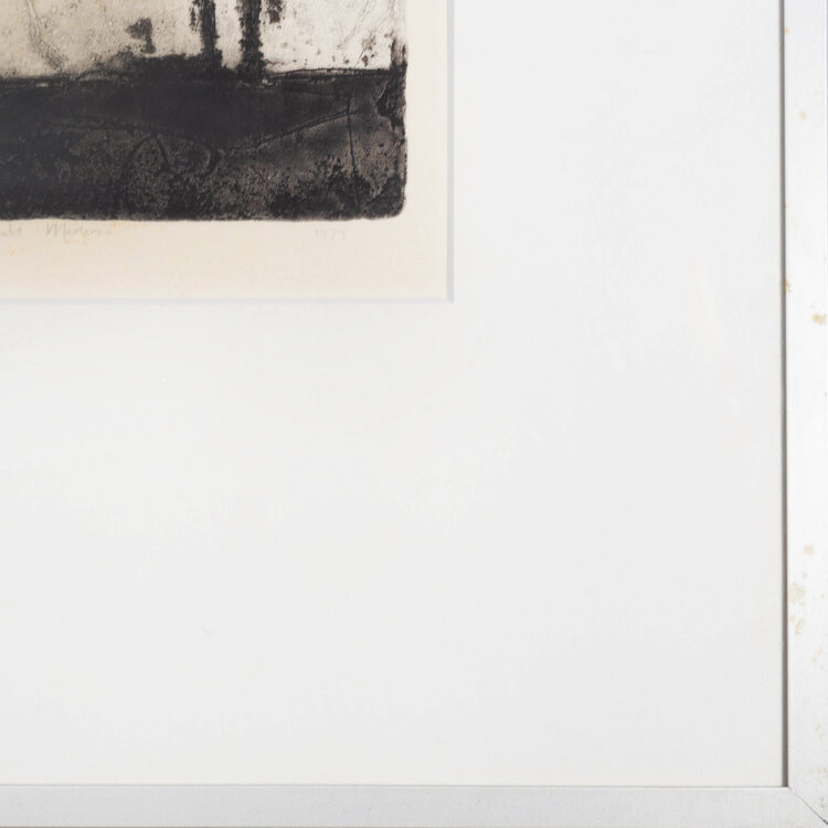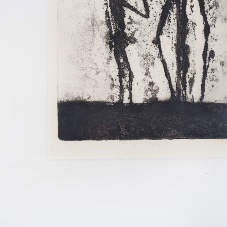 Ronald Medema, 'De geldeters', 1979. Ets/aquatint met passe-partout in metalen lijst met kunststof plaat, oplage 8/35. Afbeelding van vier zwarte figuren. Signatuur rechtsonder. Conditie: papier bobbelt in lijst. Afmetingen incl lijst: ca 66 x 51 cm.