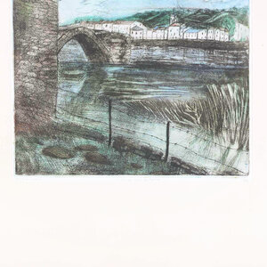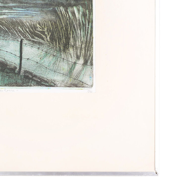 Ronnie Meerts, Lente aan de Loire, jaartal onbekend. Ets in metalen lijst, oplage 5/15. Afbeelding van een brug over de Loire met daarachter een dorpsgezicht. Linksonder signatuur, in midden titel, rechtsonder signatuur. Conditie: Gebruikssporen aan de lijst. Afmeting lijst: 71 x 51 cm.