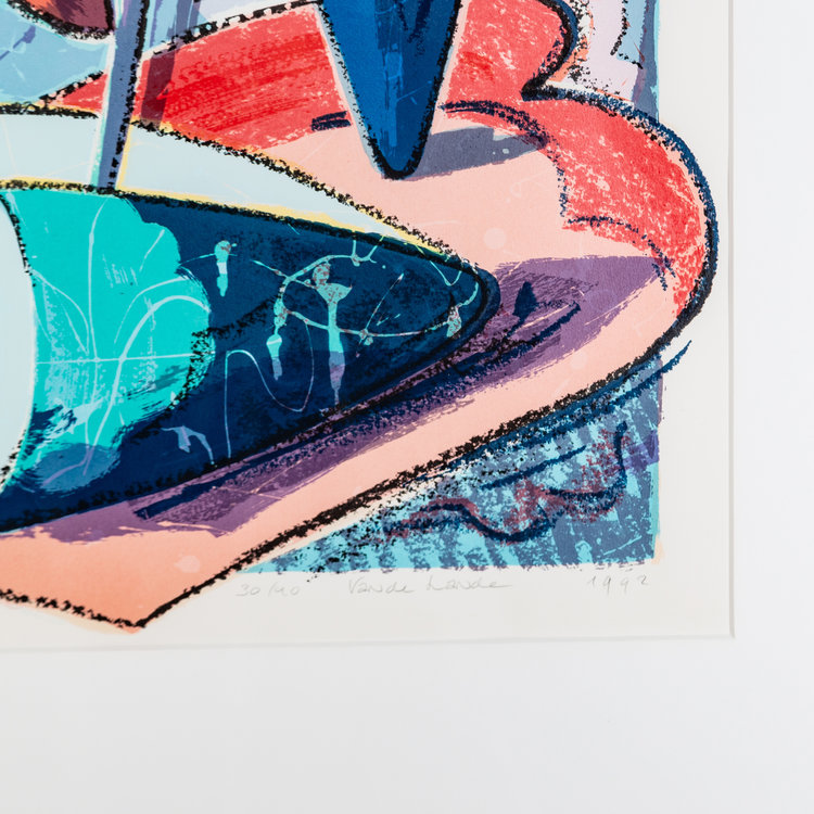 S. van der Lande, Hoezee, 1992. Zeefdruk op papier in metalen lijst, oplage 30/40. Kleurrijke abstracte voorstelling lijkend op een stilleven met een vaas met tulpen. Titel linksonder, oplagenummer, signatuur en jaartal rechtsonder. Conditie: goed, gebruikssporen aan lijst. Afmeting werk zonder lijst: 62 x 45 cm.