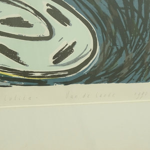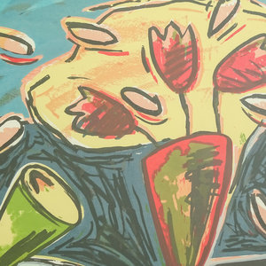 S. van der Lande, Lolita, 1990. Zeefdruk, oplage 17/25. Kleurrijke geabstraheerde voorstelling met tulpen. Afmetingen: beeldvlak 66 x 50 cm. Conditie: Het werk is in goede conditie maar de lijst toont sporen van gebruik en zit een beetje los.