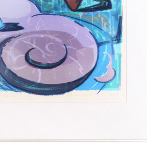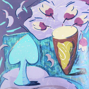 S. van der Lande, Schoppela, 1992. Zeefdruk op papier in metalen lijst, oplage 1/44. Kleurrijk stilleven van een vaas met tulpen en de schoppen vorm, in voornamelijk blauw en paars tinten. Linksonder oplagenummer, daarnaast titel, signatuur en jaar. Conditie: gebruikssporen aan lijst. Afmeting lijst: 91 x 71 cm.