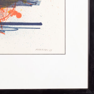 Sam Middleton, 'Compositie', 1969. Litho, oplage 39/100, met passe-partout in zwarte lijst. Abstracte compositie in blauw, rood en geel. Signatuur en datering rechtsonder. Amerikaanse kunstenaar Sam Middleton (1927-2015) groeide op in New York en heeft over de hele wereld gewoond tot hij in 1961 naar Nederland kwam. Middleton is autodidact, maar heeft lesgegeven aan de Ateliers '63 Haarlem en aan de Koninklijke Academie in Den Bosch. Muziek, vooral jazz, en het Hollandse landschap vormden de grootste inspiratiebronnen voor het abstracte en expressionistische werk van Middleton. Hij heeft met name collages gemaakt, waarin hij partituren en foto's verwerkte. Middleton combineert deze vaak met beschilderde vlakken die samen een ritmische en dynamische uitgewogen compositie vormen. Conditie: papier is verkleurd, lijst vertoont lichte gebruikssporen. Afmetingen: 79 x 62 cm.