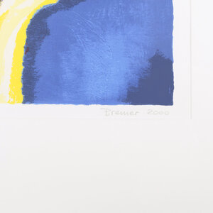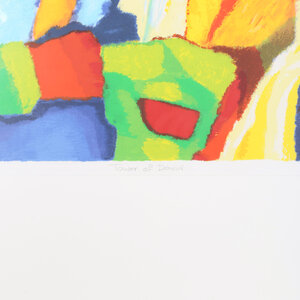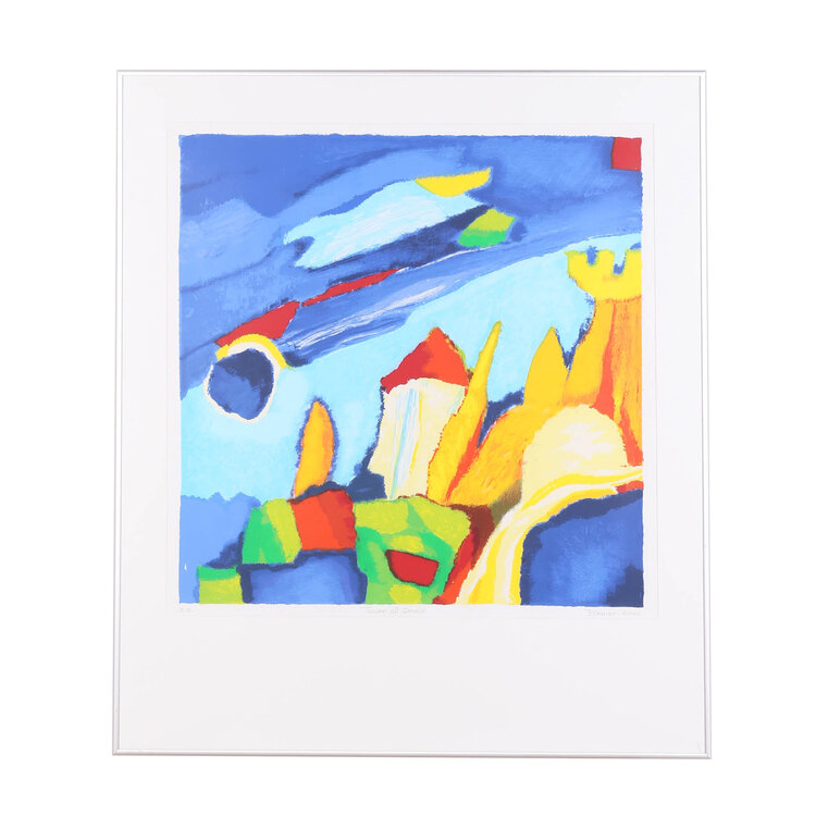 Saskia Bremer, Tower of David, 2000. Zeefdruk op papier in metalen lijst, E.A.. Kleurrijke abstracte voorstelling van een dorpsgezicht. Linksonder in potlood E.A., in midden titel en rechtsonder signatuur en jaartal. Conditie: goed, gebruikssporen aan lijst. Afmeting werk zonder lijst: 55 x 54 cm; incl. lijst: 80 x 70 cm.