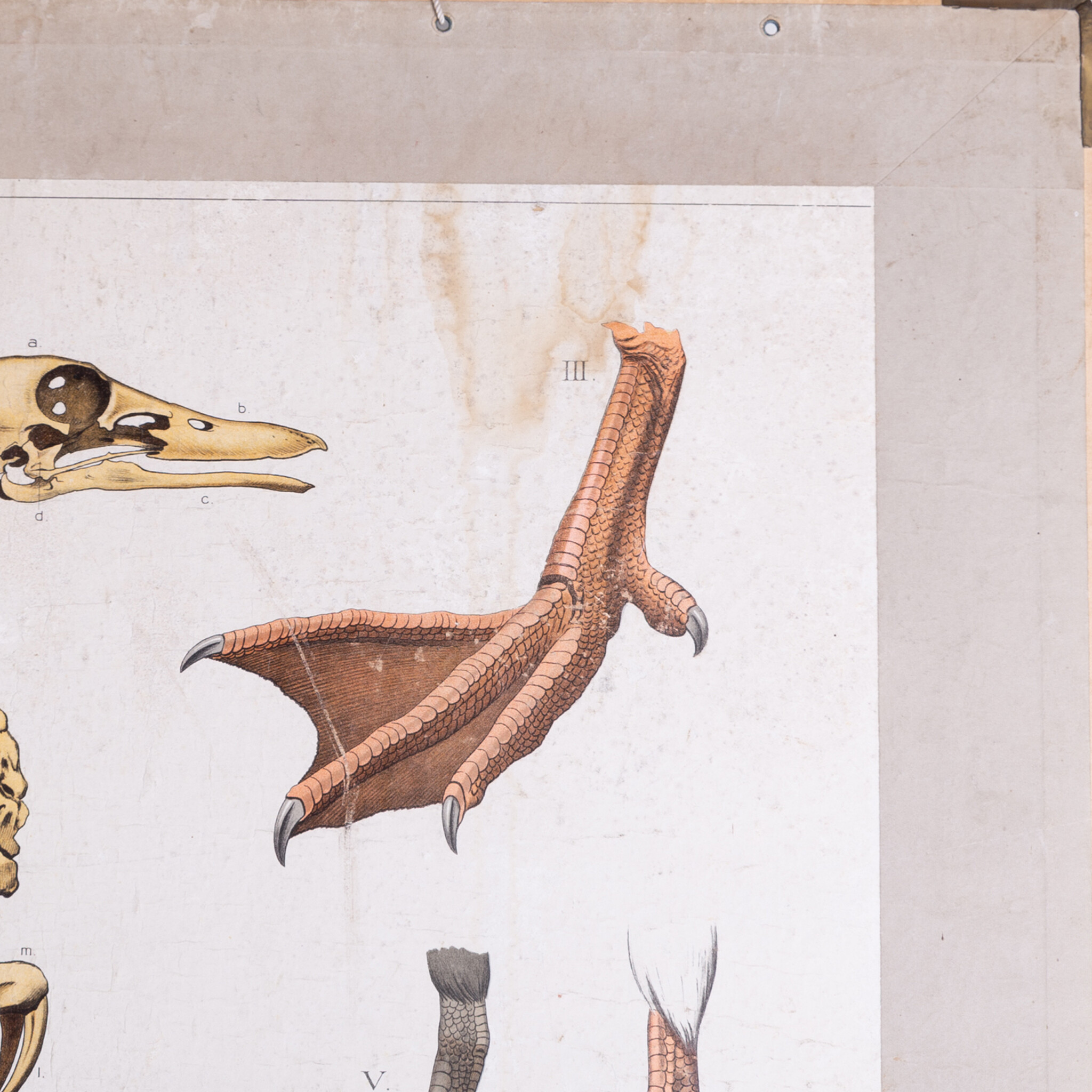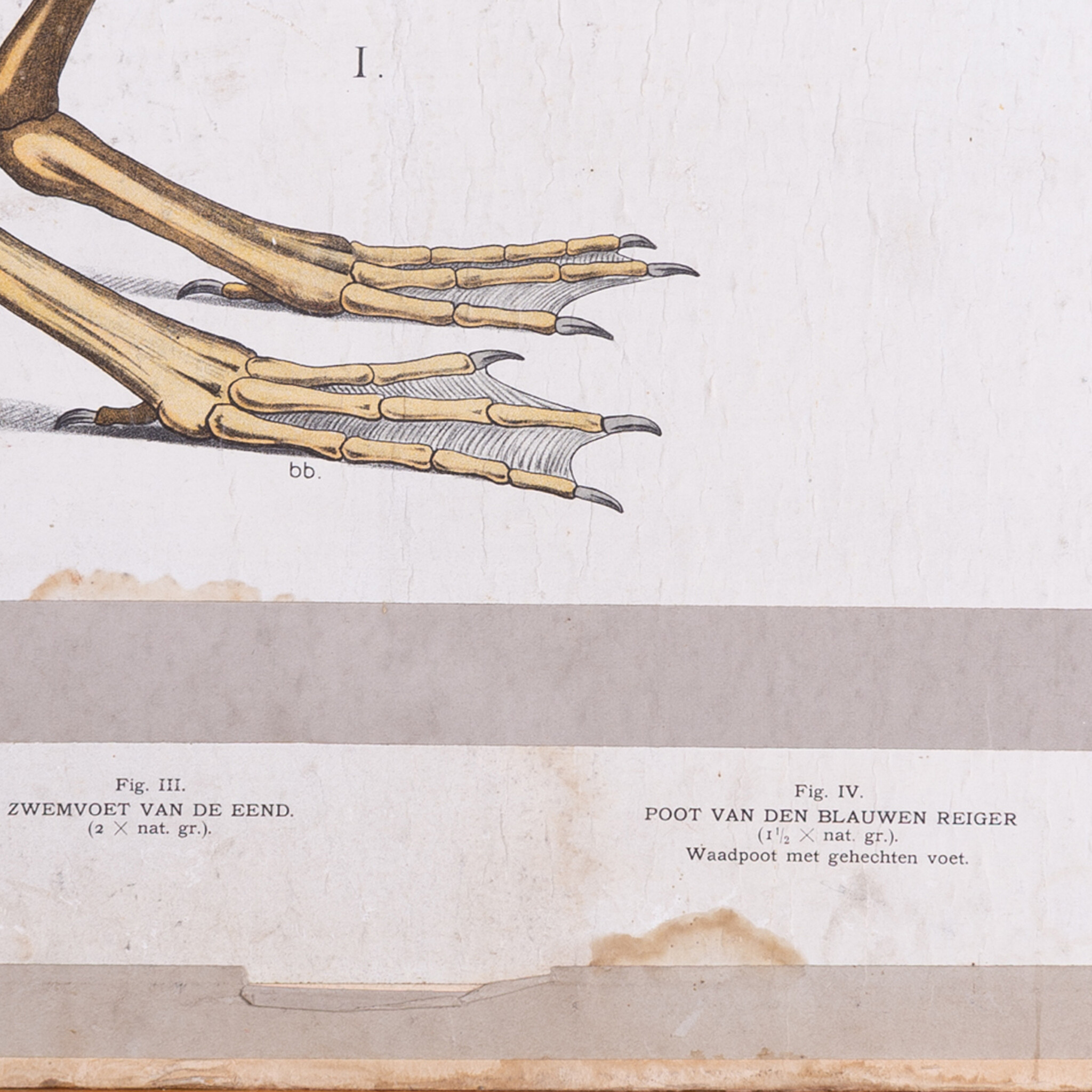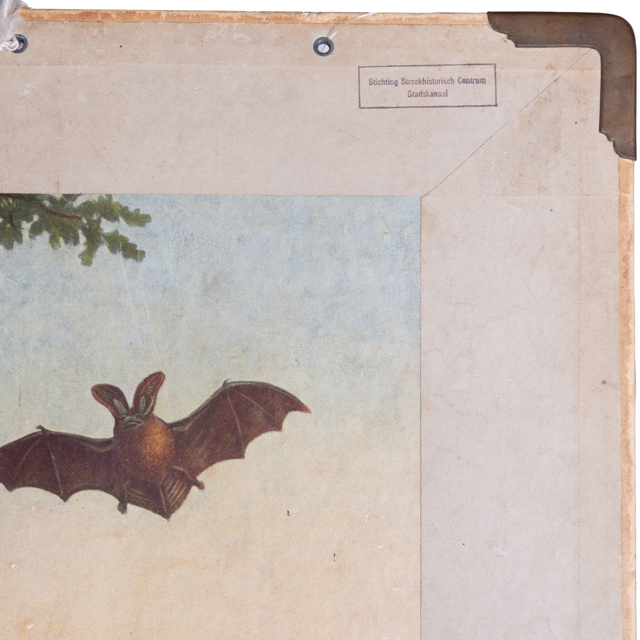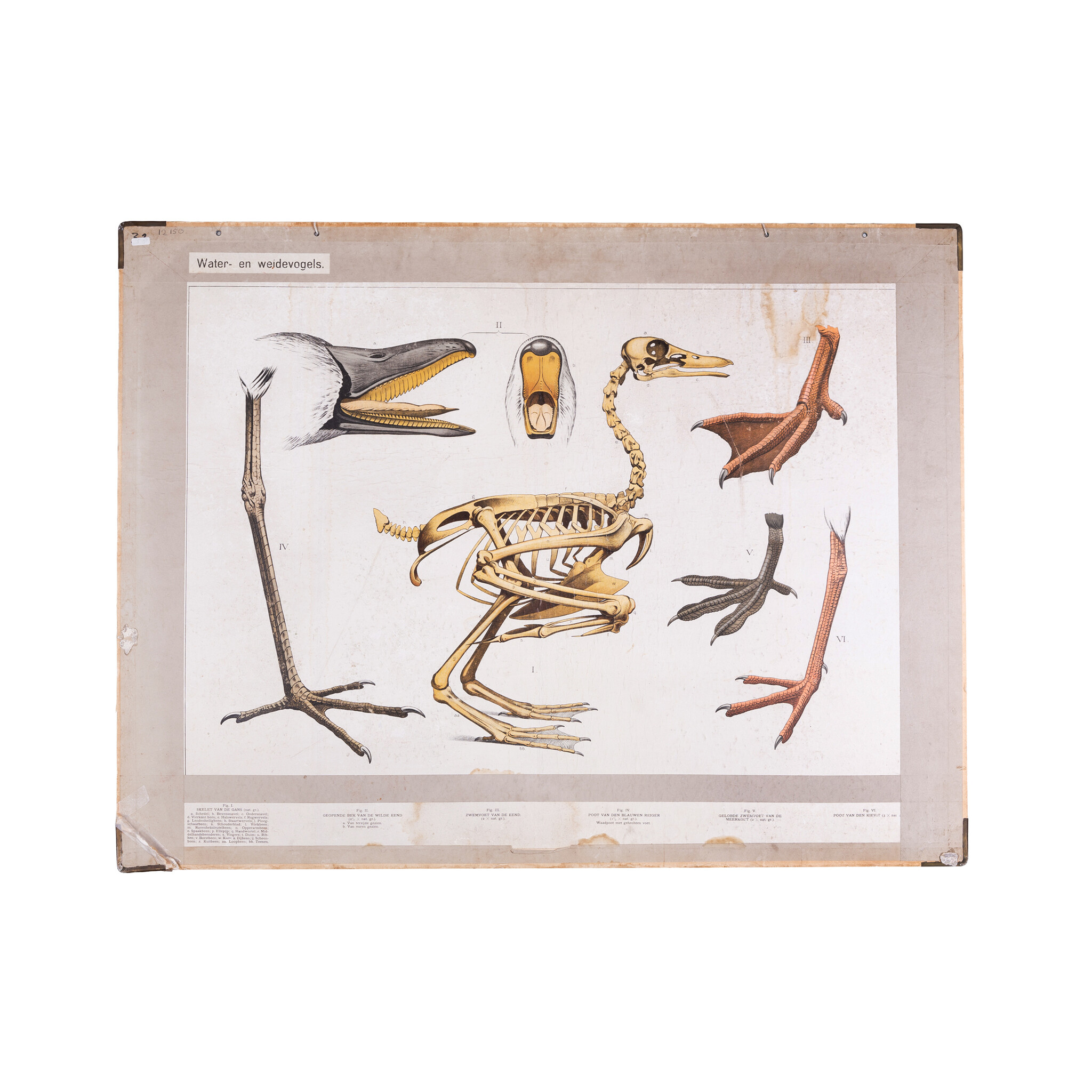 Schoolplaat 'Vrienden der duisternis' met aan de achterzijde de bijplaat 'Water- en weidevoges' van M.A. Koekoek. De bekende plaat van Koekoek met een diverse nachtdieren, o.a. uilen, vleermuis en muis. Aan de achterzijde een instructieve plaat over de anatomie van vogels, met aan de onderzijde de bijbehorende uitleg. Datering: begin van de 20e eeuw. Conditie: verkleuring en gebruikssporen zoals krassen, hoek rechtsonder is gescheurd, aan de achterzijde wat vlekken. Afmetingen: ca. 70 x 93 cm.