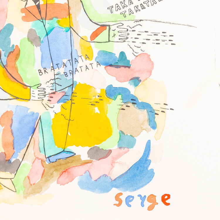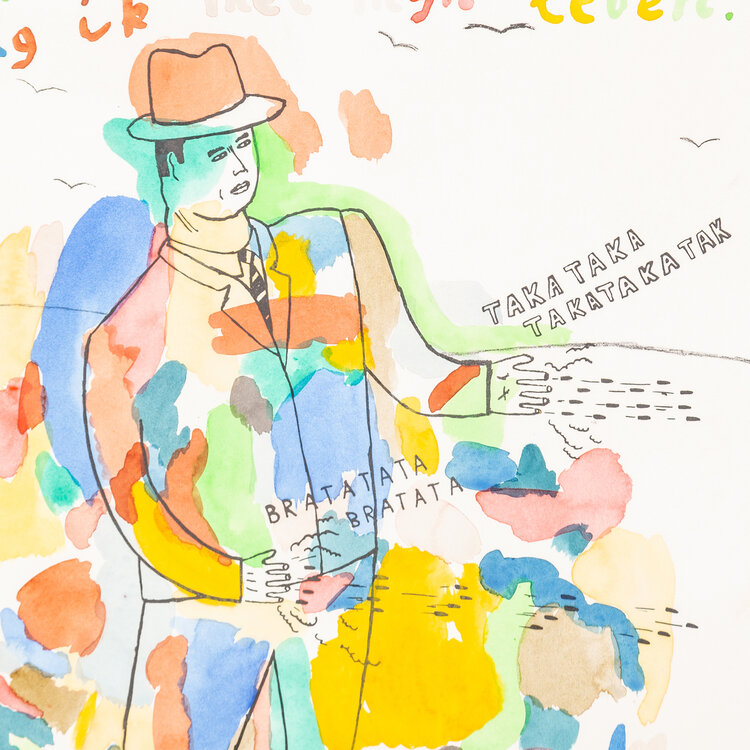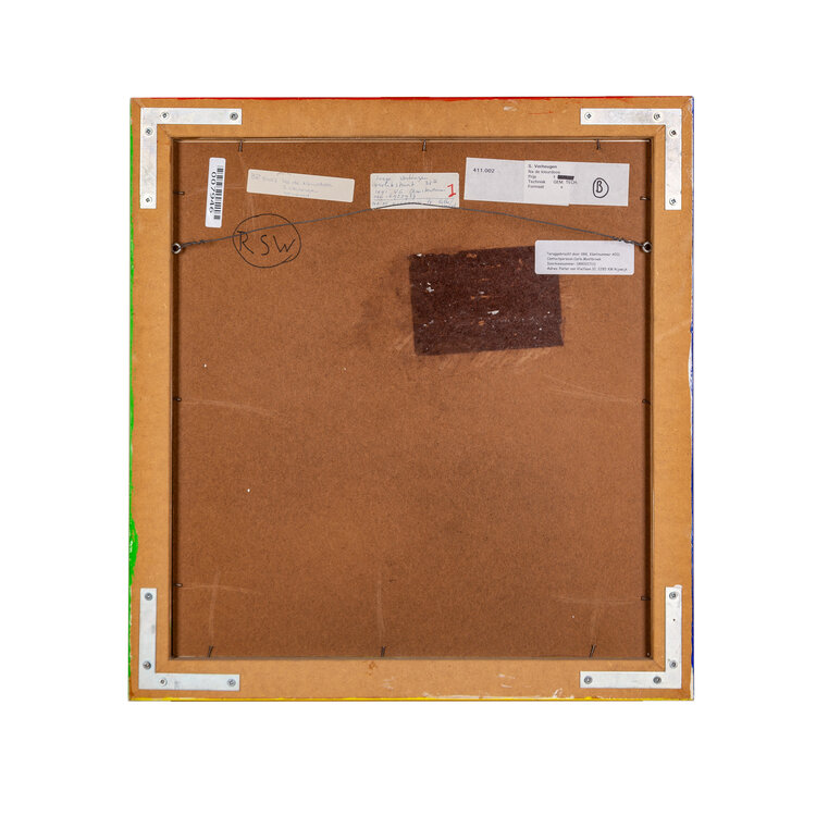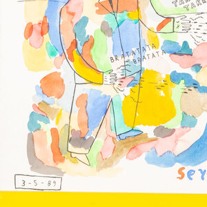 Serge Verheugen, Na de kleurdoos, 1989. Gemengde techniek op papier in gekleurde lijst. Illustratie van een man die uit zijn vingers kogels schiet, daarboven de tekst: "mijn nieuwe kleruendoos verdedig ik met mijn leven". De illustratie is een litho en met aquarel zijn kleuraccenten aangebracht. Linksonder datum, rechtsonder signatuur. Conditie: goed, gebruikssporen aan lijst. Afmeting werk zonder lijst: 50 x 46 cm.