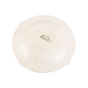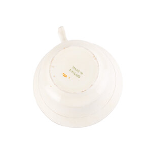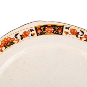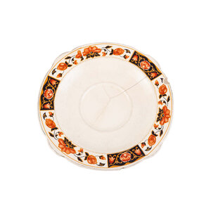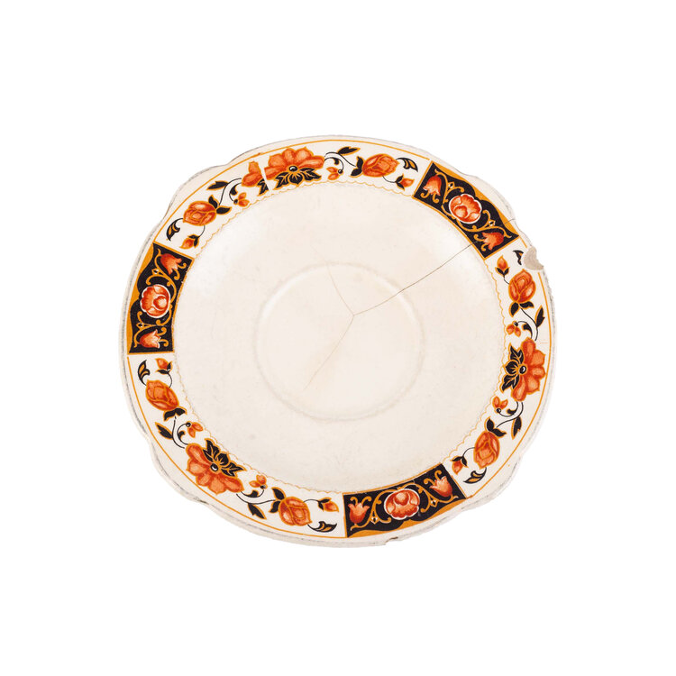 Set vintage aardewerk van Bakewell Bros Ltd. Hanley England, bestaande uit een kop en schotel en bord. Het aardewerk is versierd met een bloemenrand in rood, zwart en bruin en gouden randje. Op de achterzijde het merkteken van Bakewell Bros. Datering: 1927-1943. Conditie: gebruikt, de schotel heeft een barst en chip aan de rand en de opdruk toont slijtage. Afmetingen: bord; ø 22 x 2 cm, schotel: ø 15 x 2 cm, kop: 6 x 12 x 10 cm.