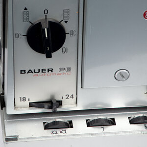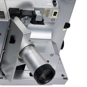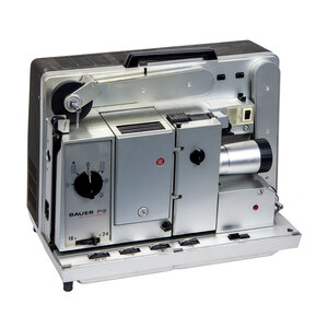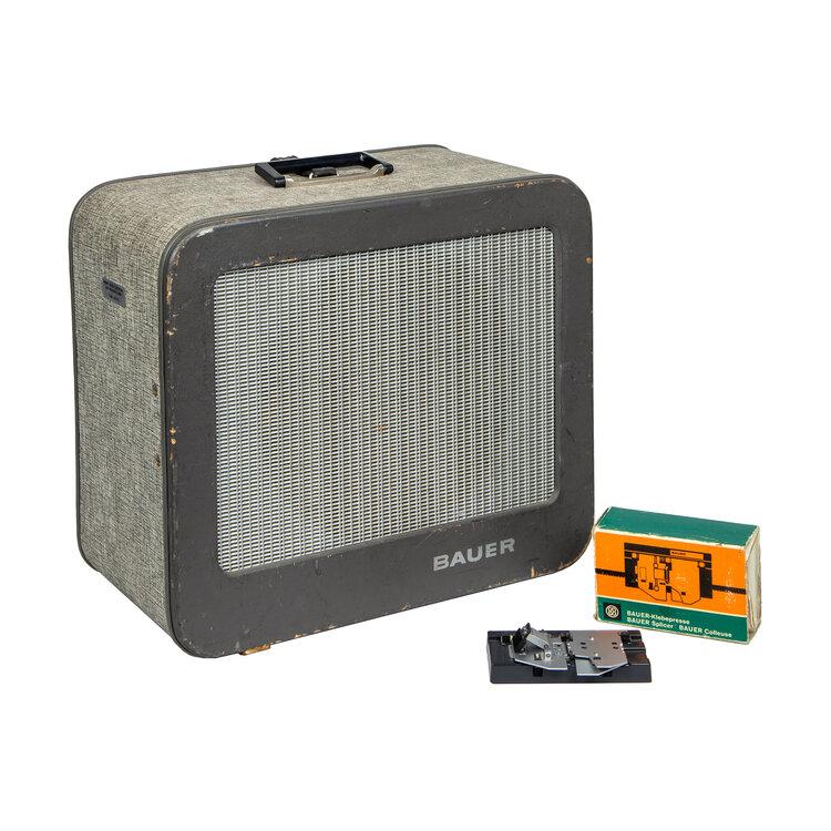 Bauer P6 Automatic 16mm Filmprojector, Bauer geluidsbox en Bauer filmsplitser. De P6 Automatic projector heeft een Bauer Vario lens 16 1:16; 35-65 en zit in een opbergbox, inclusief filmspoel en twee lampjes. In de set zit tevens een Bauer geluidsbox en een 18mm filmsplitser in originele verpakking. Datering: jaren 1960. Conditie: hier en daar gebruikssporen, maar nog in mooie staat. Werking is niet getest. Afmetingen opbergbox filmprojector: H 42, B 44 x D 30; box: H 38 x B 43 x D 23; splitser: H 5,5 x B 13,5 D x 8,5.
