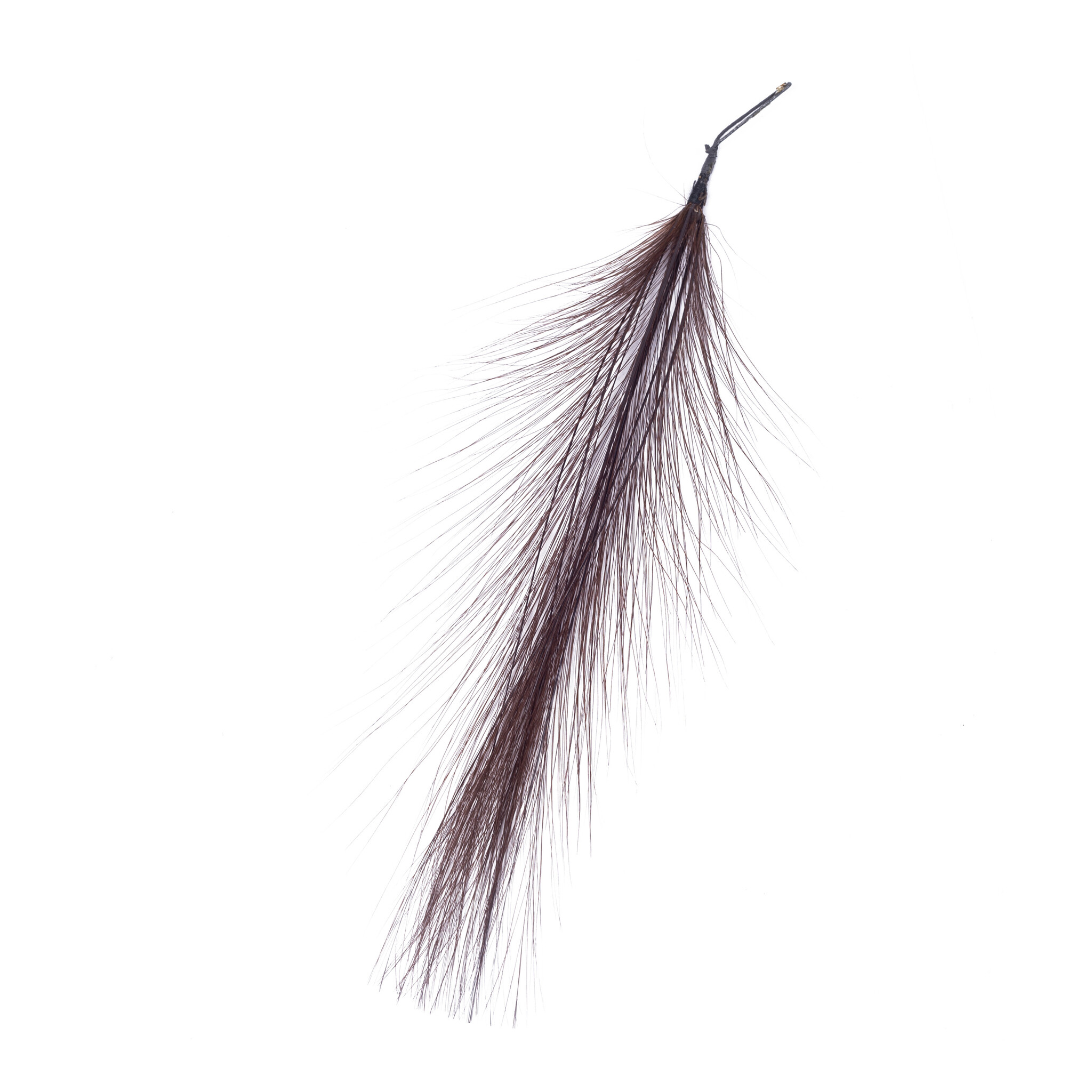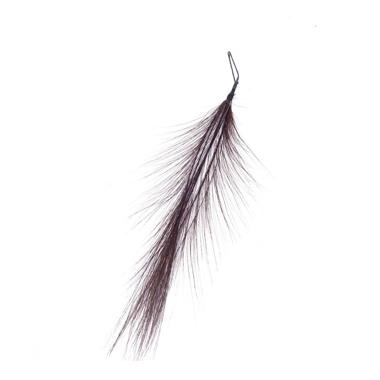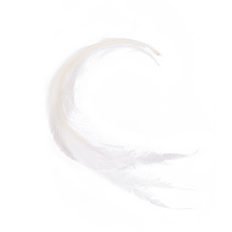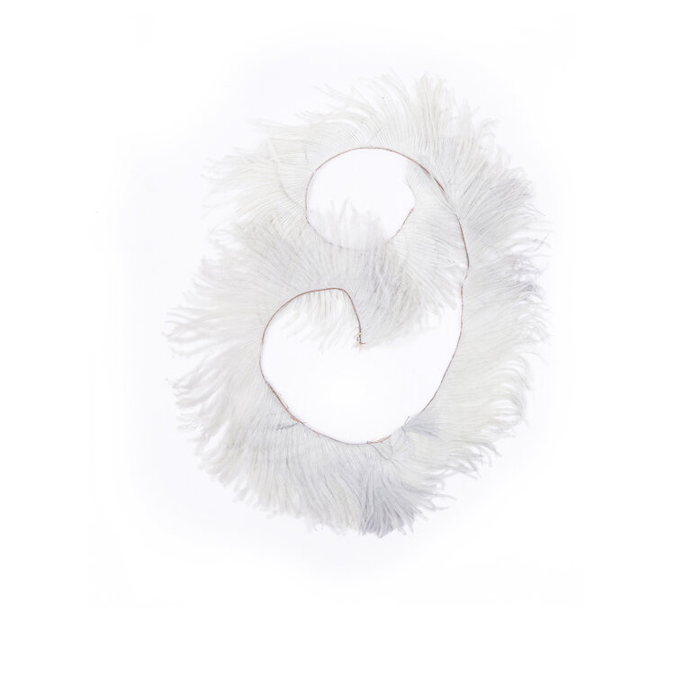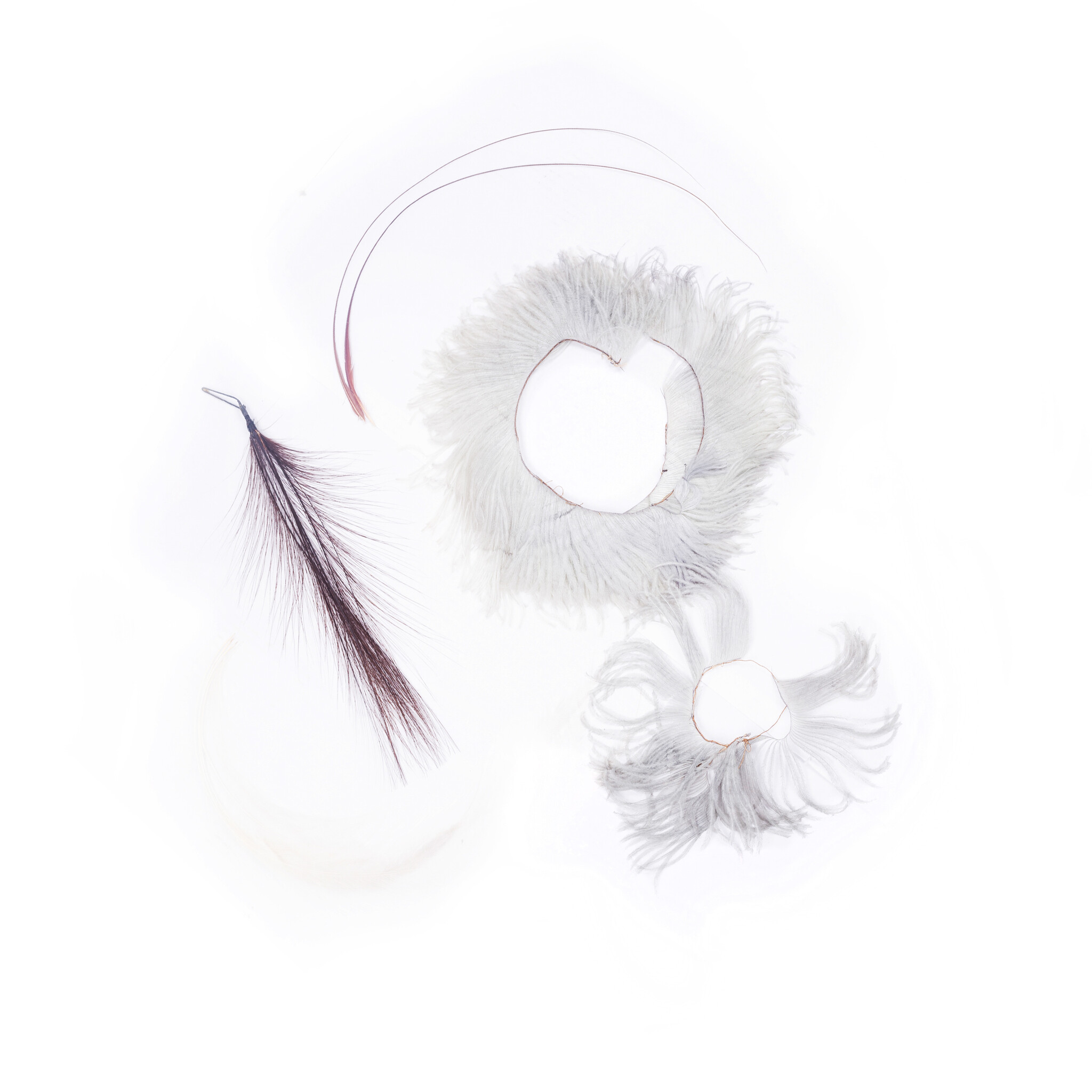 Set van verschillende soorten exotische veren. Een lichtgrijze veer en een klein deel van een zelfde veer, aan de binnenkant vastgezet met een stukje metaaldraad (ca 80 x 7 cm, 20 x 7 cm); Acht witte veren met fijne baarden in verschillende lengten (ca 22 - 55 x 4 cm); Twee smalle bruine veren (ca 45 x 0,5 cm); Acht zwarte veren samengebonden en vastgezet op een ijzerdraadje (ca 35 x 10 cm). Datering: eerste helft 20ste eeuw. Conditie: de vintage veren zijn kwetsbaar en vertonen gebruikssporen.