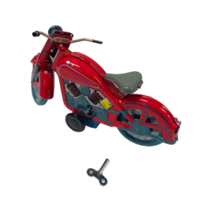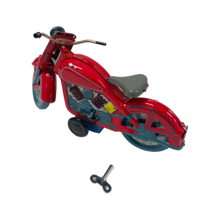 Set van drie motorvoertuigen bestaande uit een rode plastic auto, een gele Renault Kangoo en een tinnen opwind motor. De motor en Kangoo zitten nog in de originele verpakking. Datering: eind 20ste eeuw. Conditie: de Kangoo is als nieuw in de doos; enkel beschadiging aan de verpakking. De andere stukken tonen hier en daar gebruikssporen en de rode auto mist een koplamp. Afmetingen: 8 x 12 x 12 cm; 9,5 x 24 x 14 cm en 8,5 x 19,5 x 9 cm.
