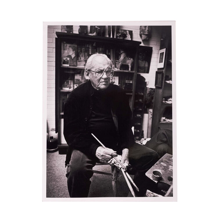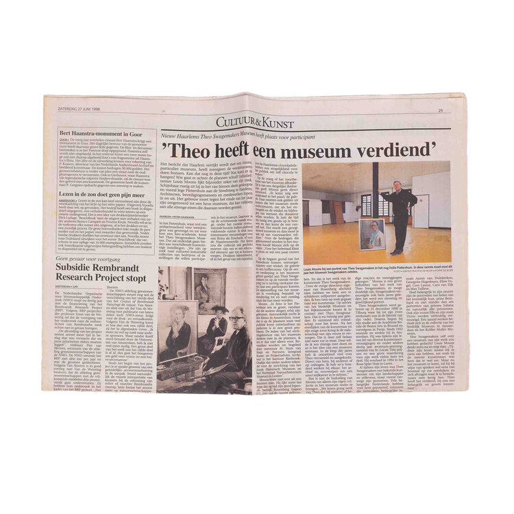 Set van acht foto's van Theo Swagemakers aan het werk op plaatmateriaal. Vier foto's van Swagenmakers aan het werk en samen met Elly op de bank. Boek met overzicht van Swagemakers oevre ISBN 9789062 166145 door Frans Duister. Diverse tentoonstellingscatalogi en krant met artikel over het Theo Swagemakers museum. Conditie: De boeken en foto's zijn in gebruikte conditie. Afmetingen: Foto's op plaat materiaal: 40,5 x 32 cm. Kleine foto's ca. 24 x 18 cm. Tentoonstelligscatalogi 31x 25 cm.