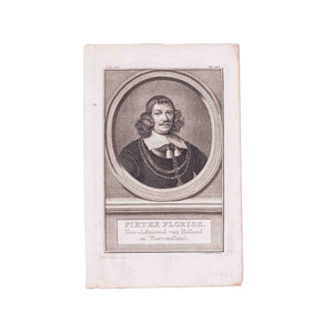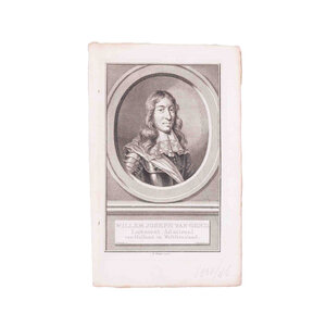 Prent 'Pieter Florisz' (Monnickendam, 1602 of 1606 - Slag in de Sont, 8 november 1658), Vice-Admiraal van Hollland en Westvriesland; Prent 'Willem Joseph van Gend' (Winssen, 14 mei 1626 - Slag bij Solebay, 7 juni 1672), Luitenant Admiraal van Holland en Westfriesland; Prent 'Abraham van der Hulst' (Amsterdam, 11 april 1619 - 12 juni 1666), Vice-Admiraal van Holland en West-Vriesland; Prent 'Gerard Kallenberg' (1642-1722), Luitenant-Admiraal van Holland en Westfriesland; Prent 'Egbert Meeuwzoon Kortenaar' (Groningen ca.1604 - bij Lowestoft 13 juni 1665), Luitenant-Admiraal van Holland en Westfriesland; Prent 'Aerd van Nes' (Rotterdam, 13 april 1626 - Rotterdam, 13 of 14 september 1693), Luitenant-Admirael van Holland en Westvriesland; Prent 'Isaak Sweers' (Nijmegen, 1 januari 1622 - 21 augustus 1673), Vice Admiraal van Holland en West-Vriesland. Gravures van Jacob Houbraken. De prenten zijn zwart-wit. Datering: ca. 1749-1760. Conditie: De prenten vertonen sporen van ouderdom. Verkleuring, vlekken en kleine beschadigingen aan de randen. Afmetingen beeldvlak prenten: ca. 17 x 10 cm.