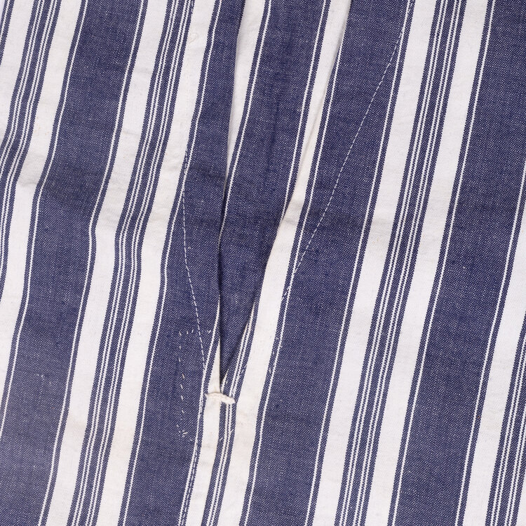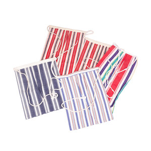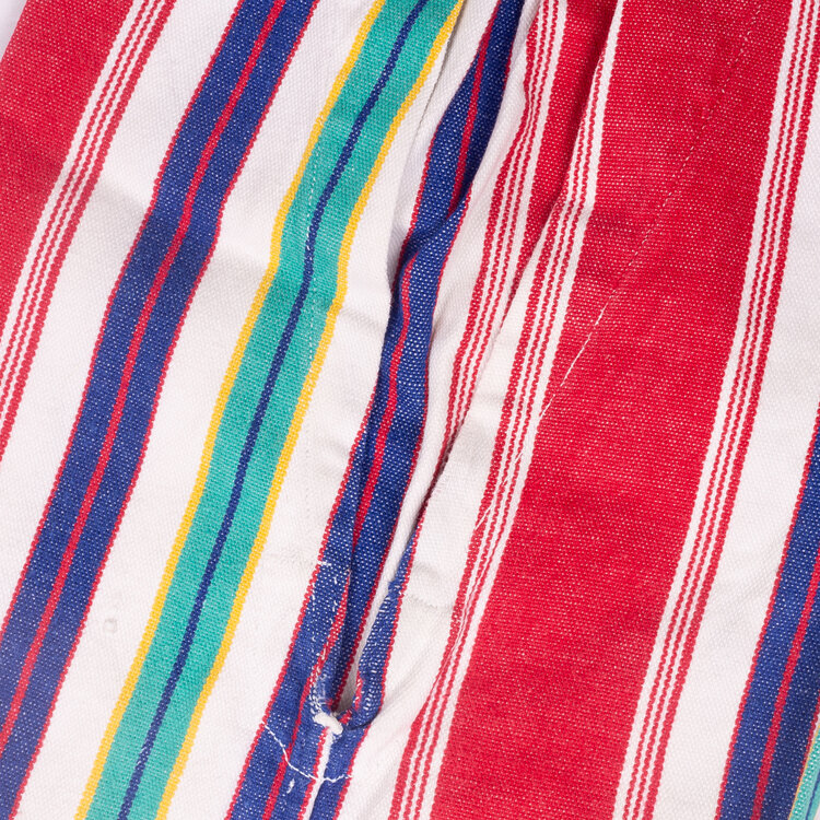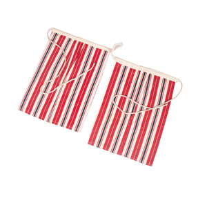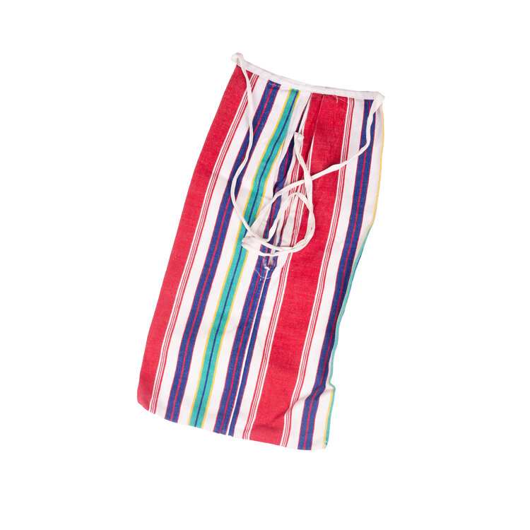 Zijzakken, twee dubbele en een enkele. Veelkleurig gestreepte losse zakken met een koord, waarmee de zakken rond het middel geknoopt konden worden. De zijzakken of dijzakken werden onder de rok gedragen en werden gebruikt om diverse spullen in mee te nemen. Datering: begin 20ste eeuw. Conditie: sporen van gebruik, lichte verkleuring. Afmetingen: dubbele ca 31 x 24 x 1 cm: enkele ca 40 x 21 x 1 cm.