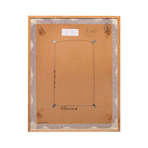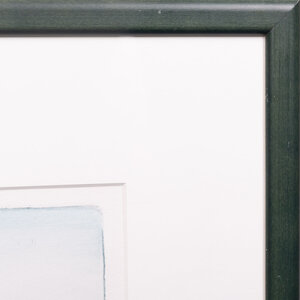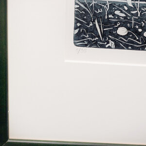 Sjoerd Bakker, zonder titel, 1980. Kleurenets in groene houten lijst, oplage 5/35. voorstelling in turquoise tinten van plant tegen een achtergrond van gebouwen. Conditie: Het werk is in zeer goede staat, de lijst toont sporen van gebruik. Afmetingen: ca. 71 x 58 cm.