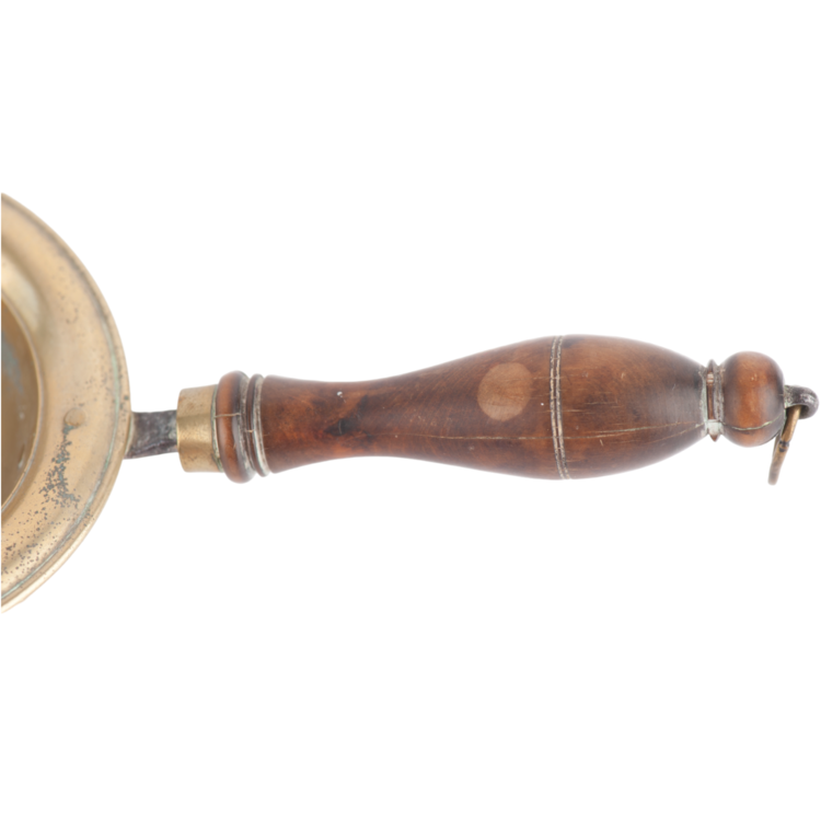 Koperen ronde binnenbak van een pijpkomfoor met aan weerszijden twee schuin opstaande houten handvatten met ophangringen. Datering: 20e eeuw. Conditie: prima, hier en daar gebruikssporen en patina. Afmetingen: ca. Lang 25cm, hoog 5,5cm