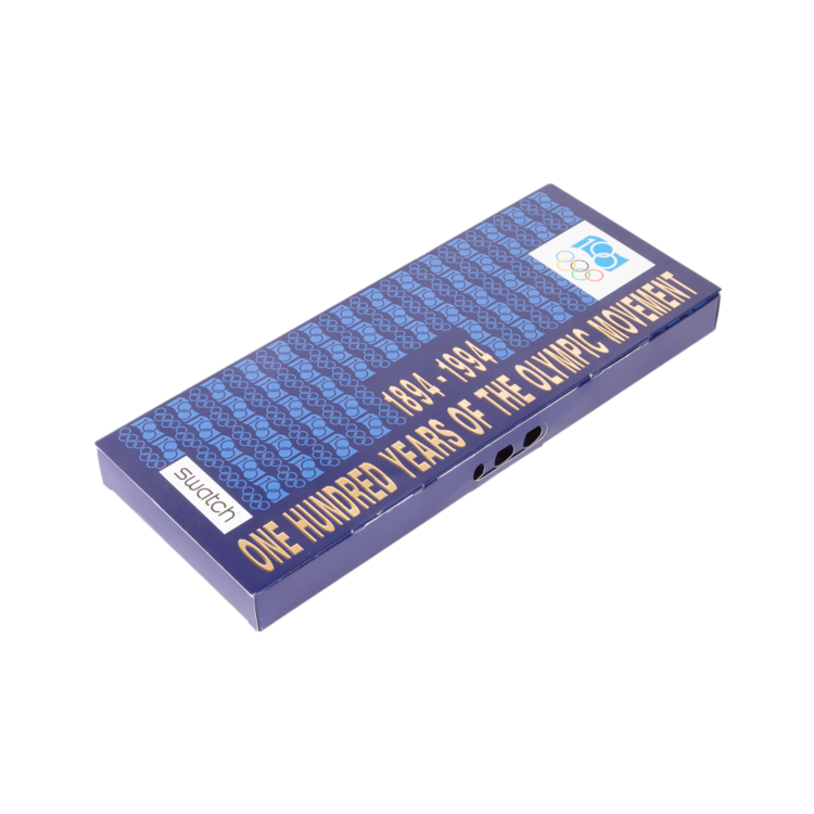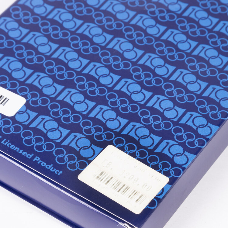 Swatch '1894-1994 One Hundred Years of the Olympic Movement' (SCZ1011), 1994. C-H-R-O-N-O horloge met donkerblauwe, met lichtblauw bedrukte armband en een wijzerplaat met de olymische ringen in blauw en zilverkleur. Deze editie is bewaard in de originele verpakking. Swatch werd in 1983 opgericht en onderscheidt zich als Zwitsers horlogemerk met zijn slimme techniek en bijzondere ontwerpen, die in beperkte oplage werden uitgevoerd. Vanwege de grote hoeveelheid verschillende designs en samenwerkingen werden de Swatch horloges collectors items die nog steeds wereldwijd worden verzameld. Conditie: Het horloge is in zeer goede ongebruikte conditie. Afmetingen ca. 23,0 x 4,3 x 0,8 cm