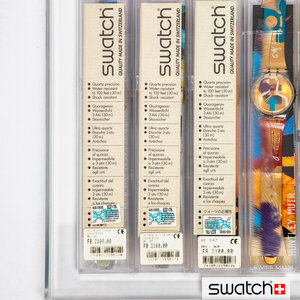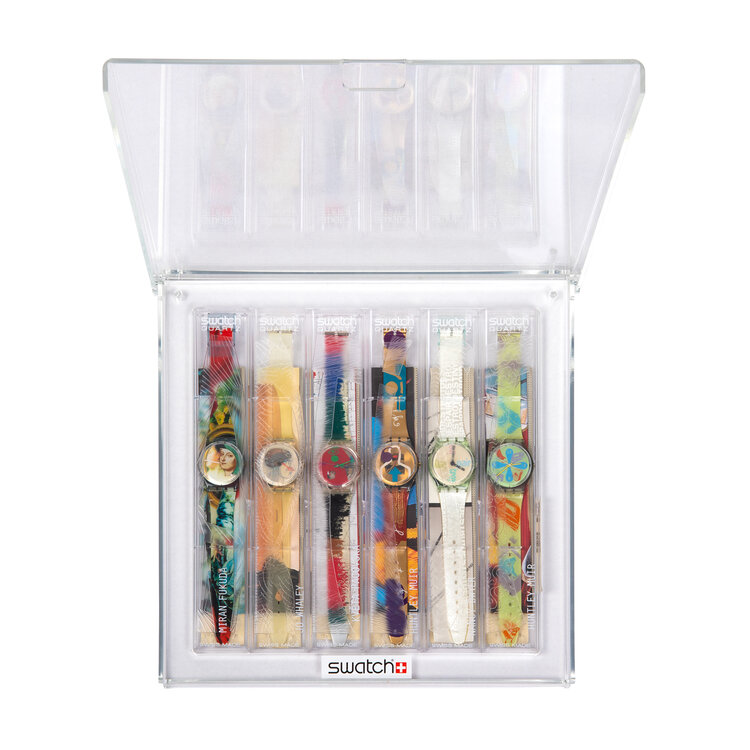 Swatch 'Artists' 1997. Kunstof, Metaal. Ca. 30 x 29 x 2,5 cm. Luxe plexiglas box met zes door kunstenaars ontworpen horloges. De box bevat horloges van Miran Fukuda (The Lady & The Mirror GN 170), Jo whaley (Ticking Brain, GN 247), Kveta Pacovská (Color Scribler, GK 249), Huntley Muir (Lipstick, GR 248), Nancy Dwyer (Destime, GG 144), Huntley Muir (Windmeal, GG 145). Swatch werkt al vanaf 1985 samen met kunstenaar om een 'artist collectie' te produceren. Conditie: De horloges en de plexiglas display bevinden zich in originele verpakking en zijn in ongebruikte conditie.