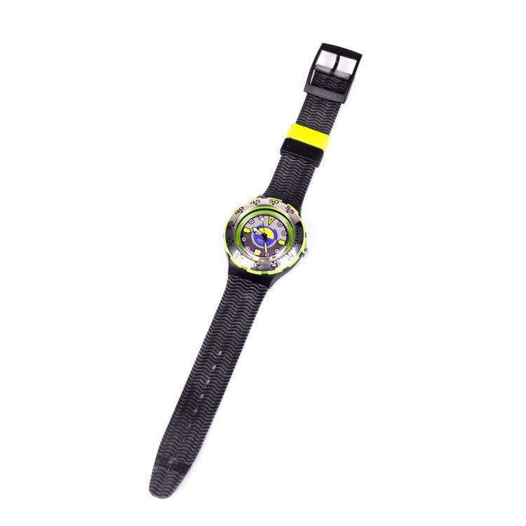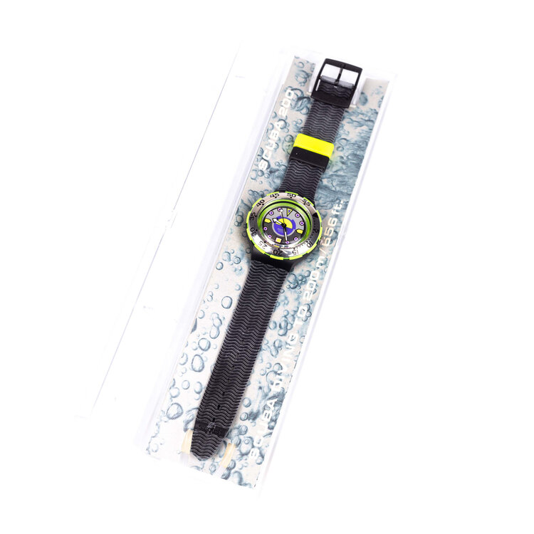 Swatch 'Bombola', 1993; Swatch 'Over the wave', 1993. Swatch Scuba 200 'Bombola' SDB 103 uit 1993, met zwart kunststof polsband; Swatch Scuba 200 'Over the wave' SDN 105 uit 1993, met transparant kunststof polsband met afbeeldingen in felle kleuren van surfers. Beide horloges hebben een draaibare lunette, zijn waterbestendig en hebben een precisie quartz uurwerk met batterij. Conditie: De horloges bevinden zich in originele verpakking en zijn ongedragen, polsbandjes kunnen verzwakt zijn door verstrijken van de tijd. Afmetingen verpakking: ca. 24,5 x 6 x 2 cm.