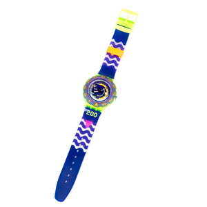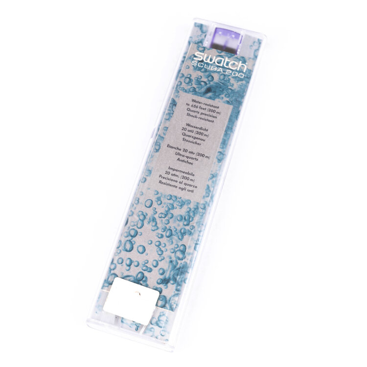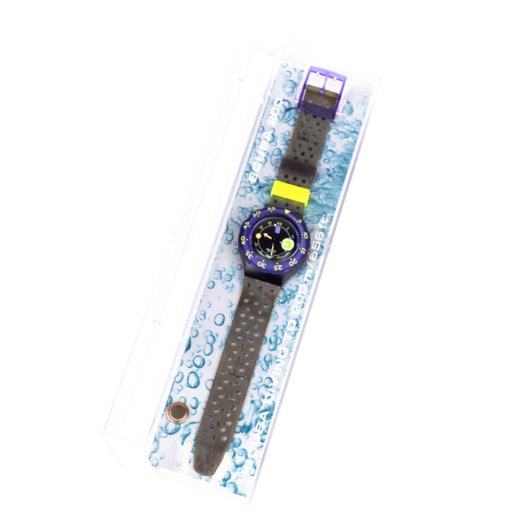 Swatch 'Captain Nemo', 1992; Swatch 'Coming Tide', 1992. Swatch Scuba 200 'Captain Nemo' SDB 101 uit 1992, met grijsgroen geperforeerde kunststof polsband; Swatch Scuba 200 'Coming Tide' SDJ 100 uit 1992, met transparant kunststof polsband met blauwe golven. Beide horloges hebben een draaibare lunette, zijn waterbestendig en hebben een precisie quartz uurwerk met batterij. Conditie: De horloges bevinden zich in originele verpakking en zijn ongedragen, polsbandjes kunnen verzwakt zijn door verstrijken van de tijd. Afmetingen verpakking: ca. 24,5 x 6 x 2 cm.