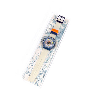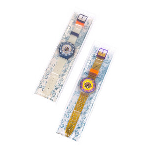 Swatch 'Hyppocampus', 1991; Swatch 'Silver Trace', 1993. Swatch Scuba 200 'Hyppocampus' SDK 103 uit 1991, met transparant okergeel kunststof polsband; Swatch Scuba 200 'Silver Trace' SDN 107 uit 1993, met grijs kunststof polsband. Beide horloges hebben een draaibare lunette, zijn waterbestendig en hebben een precisie quartz uurwerk met batterij. Conditie: De horloges bevinden zich in originele verpakking en zijn ongedragen, polsbandjes kunnen verzwakt zijn door verstrijken van de tijd. Afmetingen verpakking: ca. 24,5 x 6 x 2 cm.