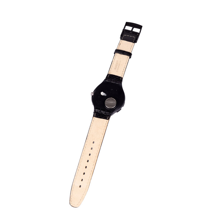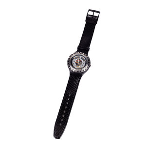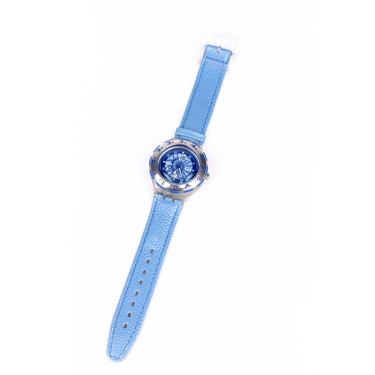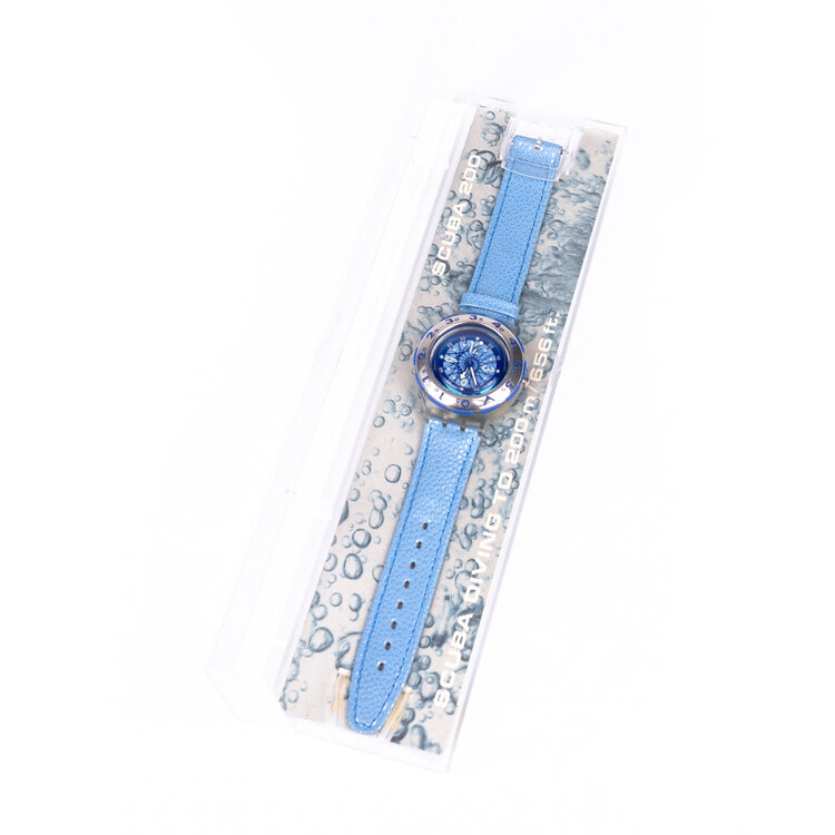 Swatch Scuba 200 'Lunaire', 1993; Swatch Scuba 200 'Squiggly', 1994. Swatch Scuba 200 'Lunaire' SDK 113 uit 1993, met blauw/zilver lederen polsbandje; Swatch Scuba 200 'Squiggly' SDB 104 uit 1994, met zwart lederen polsbandje. De wijzerplaat heeft een kleine opening in het midden, waardoor er vrij zicht is op een deel van het uurwerk. Beide horloges hebben een draaibare lunette, zijn waterbestendig en hebben een precisie quartz uurwerk met batterij. Conditie: De horloges bevinden zich in originele verpakking en zijn ongedragen, polsbandjes kunnen verzwakt zijn door verstrijken van de tijd. Afmetingen verpakking: ca. 24,5 x 6 x 2 cm.