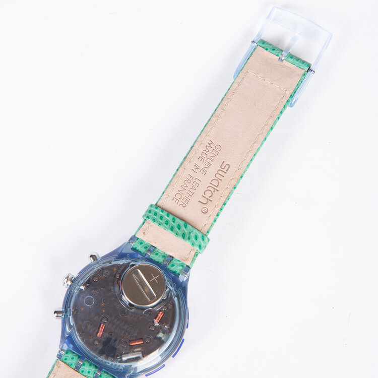 Swatch, 'American Dream' 'Slamma Jam', 1995. Kunstof, leder, 24,5 x 6 x 2 cm. Set van twee AquaChrono Mid size horloges. 'American Dream' SEK 103, Aqua chrono horloge geinspireerd op de amerikaanse vlag. 'Slama Jam' horloge met donkerblauwe rand en groen lederen horlogebandje. Swatch werd in 1983 opgericht en onderscheidt zich als Zwitsers horlogemerk met zijn slimme techniek en bijzondere ontwerpen, die in beperkte oplage werden uitgevoerd. Vanwege de grote hoeveelheid verschillende designs en samenwerkingen werden de Swatch horloges collectors items die nog steeds wereldwijd worden verzameld. Conditie: De horloges zijn in zeer goede ongebruikte conditie.