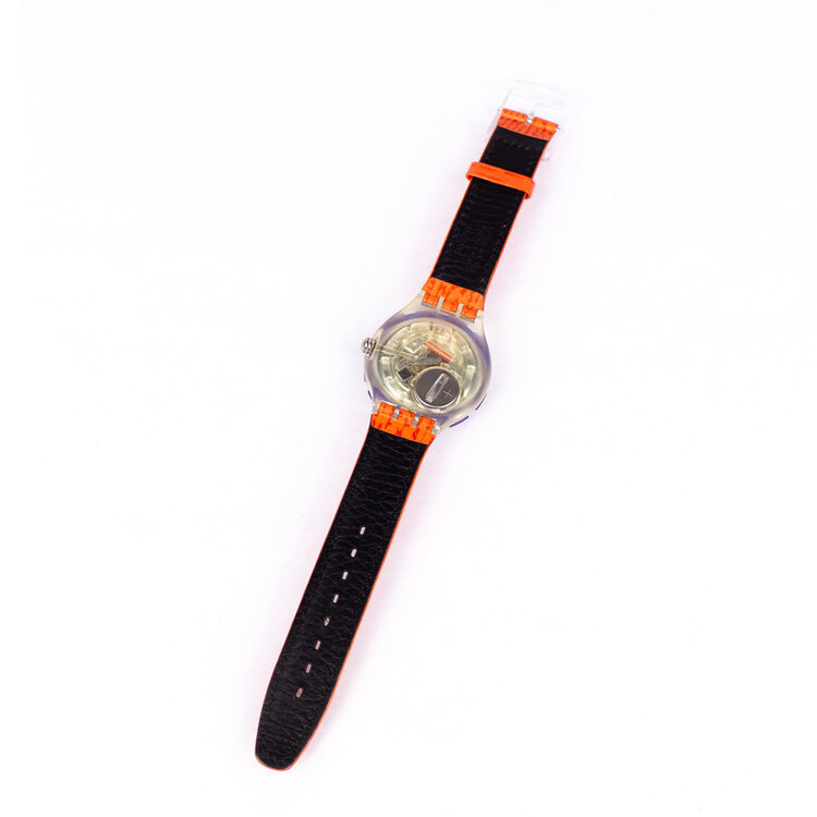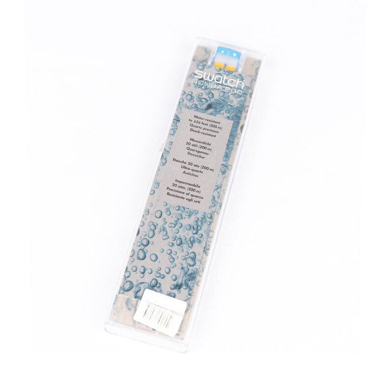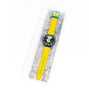 Swatch 'Red Island', 1992; Swatch 'Divine', 1993. Twee vintage Swatch horloges 'diving to 200 m/656 ft'. Swatch Scuba 200 'Red Island' SDK 106 uit 1992, met oranje lederen polsbandje; Swatch Scuba 200 'Divine' SDN 102 uit 1993, met geel lederen polsbandje. Conditie: De horloges bevinden zich in originele verpakking en zijn ongedragen, polsbandjes kunnen verzwakt zijn door verstrijken van de tijd. Afmetingen verpakking: ca. 24,5 x 6 x 2 cm.